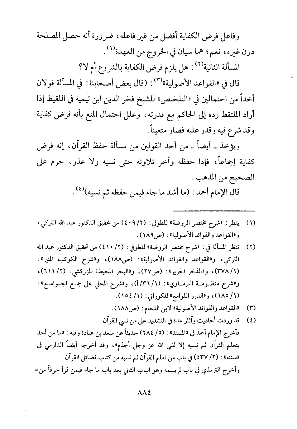وَيُؤْخَذ أَيْضا من أحد الْقَوْلَيْنِ من مَسْأَلَة حفظ الْقُرْآن، إِنَّه فرض كِفَايَة إِجْمَاعًا، فَإِذا حفظه وَأخر تِلَاوَته حَتَّى نَسيَه وَلَا عذر، حرم على الصَّحِيح من الْمَذْهَب.
