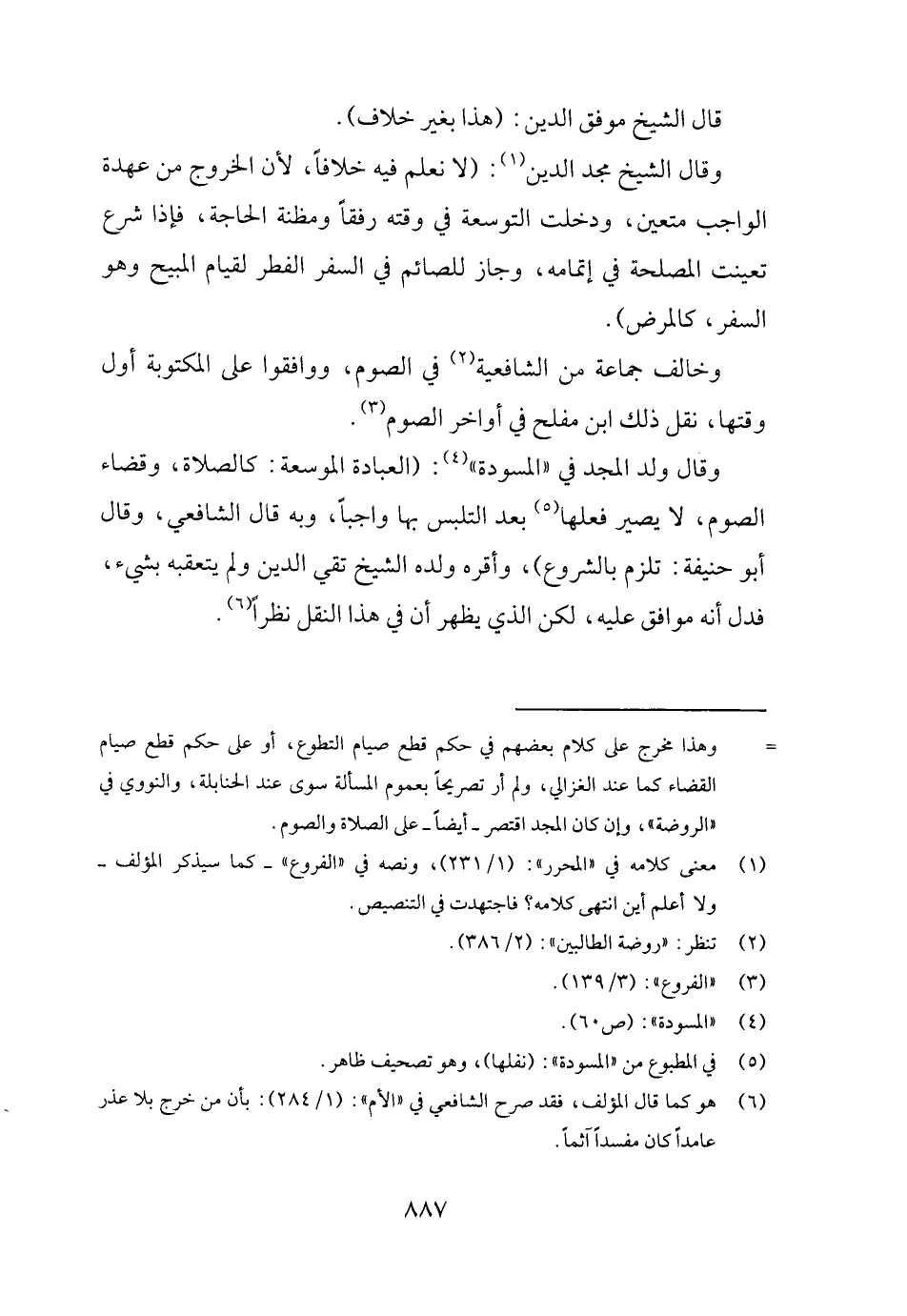 وَقَالَ الشَّيْخ مجد الدّين: (لَا نعلم فِيهِ خلافًا، لِأَن الْخُرُوج من عُهْدَة الْوَاجِب مُتَعَيّن، وَدخلت التَّوسعَة فِي وقته وَقفا ومظنة الْحَاجة، فَإِذا شرع تعيّنت الْمصلحَة فِي إِتْمَامه، وَجَاز للصَّائِم فِي السّفر الْفطر لقِيَام الْمُبِيح وَهُوَ السّفر، كالمرض) .