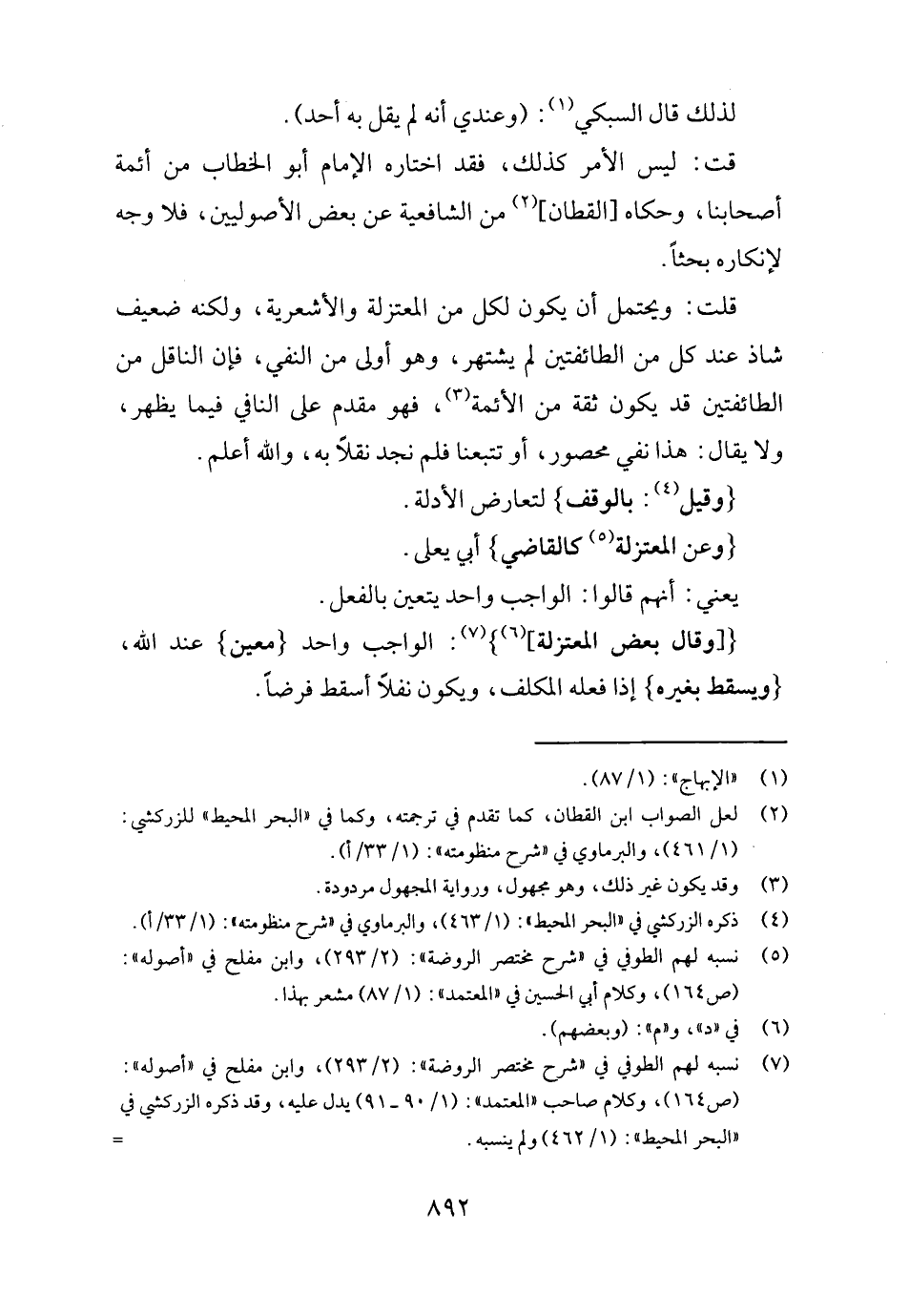 قلت: وَيحْتَمل أَن يكون لكل من الْمُعْتَزلَة والأشعرية، وَلكنه ضَعِيف شَاذ عِنْد كل من الطَّائِفَتَيْنِ لم يشْتَهر، وَهُوَ أولى من النَّفْي، فَإِن النَّاقِل من الطَّائِفَتَيْنِ قد يكون ثِقَة من الْأَئِمَّة، فَهُوَ مقدم على النَّافِي فِيمَا يظْهر، وَلَا يُقَال: هَذَا نفي مَحْصُور، أَو تتبعنا فَلم نجد نقلا بِهِ، وَالله أعلم.