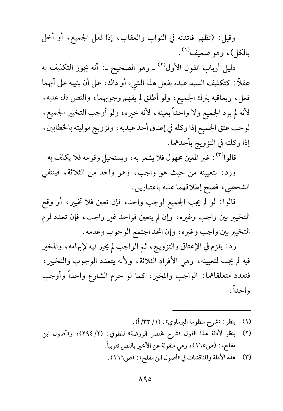 رد: يلْزم فِي الْإِعْتَاق وَالتَّزْوِيج، ثمَّ الْوَاجِب لم يُخَيّر فِيهِ لإبهامه، والمخير فِيهِ لم يجب لتعيينه، وَهِي الْأَفْرَاد الثَّلَاثَة، وَلِأَنَّهُ يَتَعَدَّد الْوُجُوب والتخيير، فتعدد متعلقاهما: الْوَاجِب والمخير، كَمَا لَو حرم الشَّارِع وَاحِدًا وَأوجب وَاحِدًا.