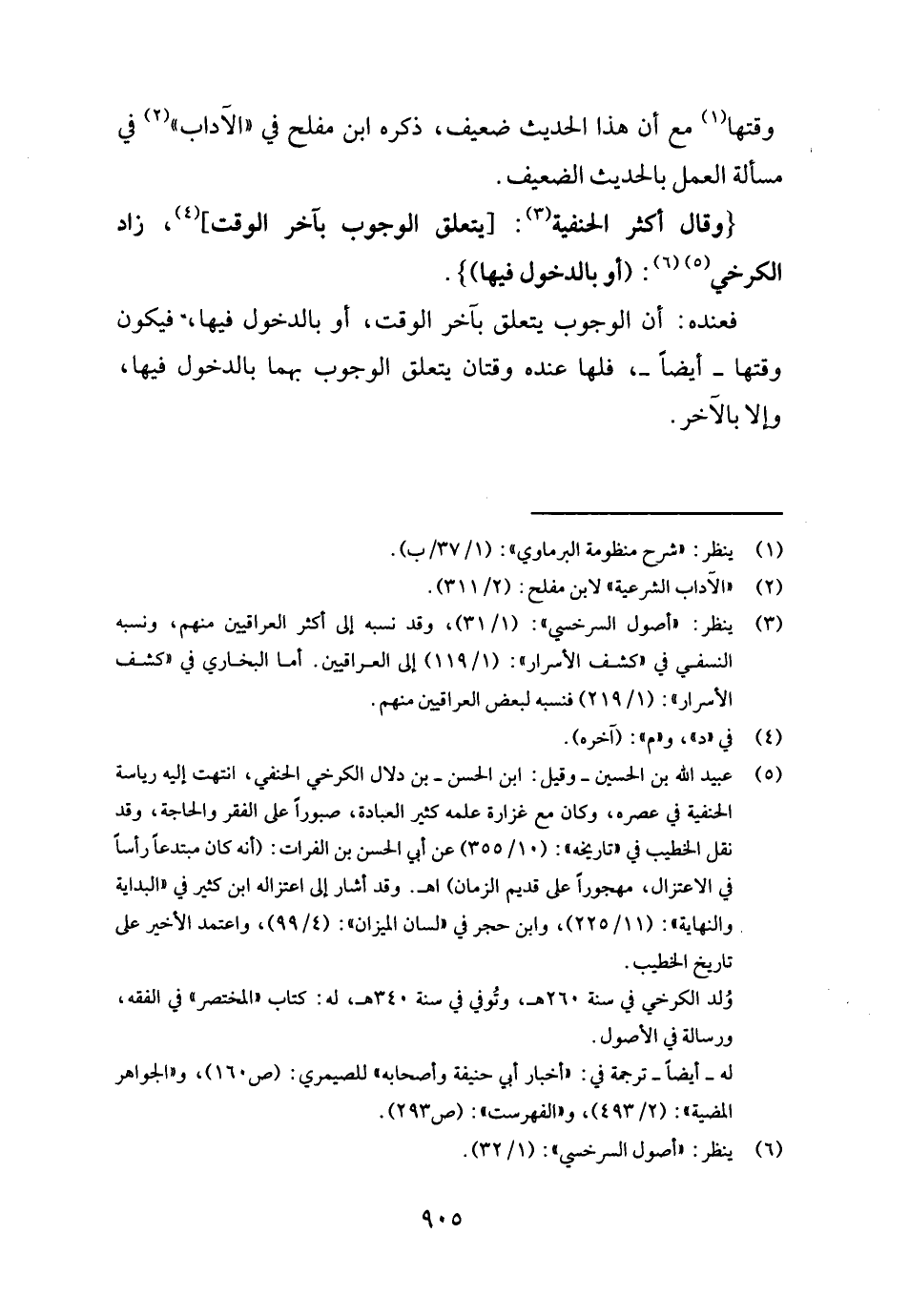 {وَقَالَ أَكثر الْحَنَفِيَّة: [يتَعَلَّق الْوُجُوب بآخر الْوَقْت] ، زَاد الْكَرْخِي: (أَو بِالدُّخُولِ فِيهَا) } .