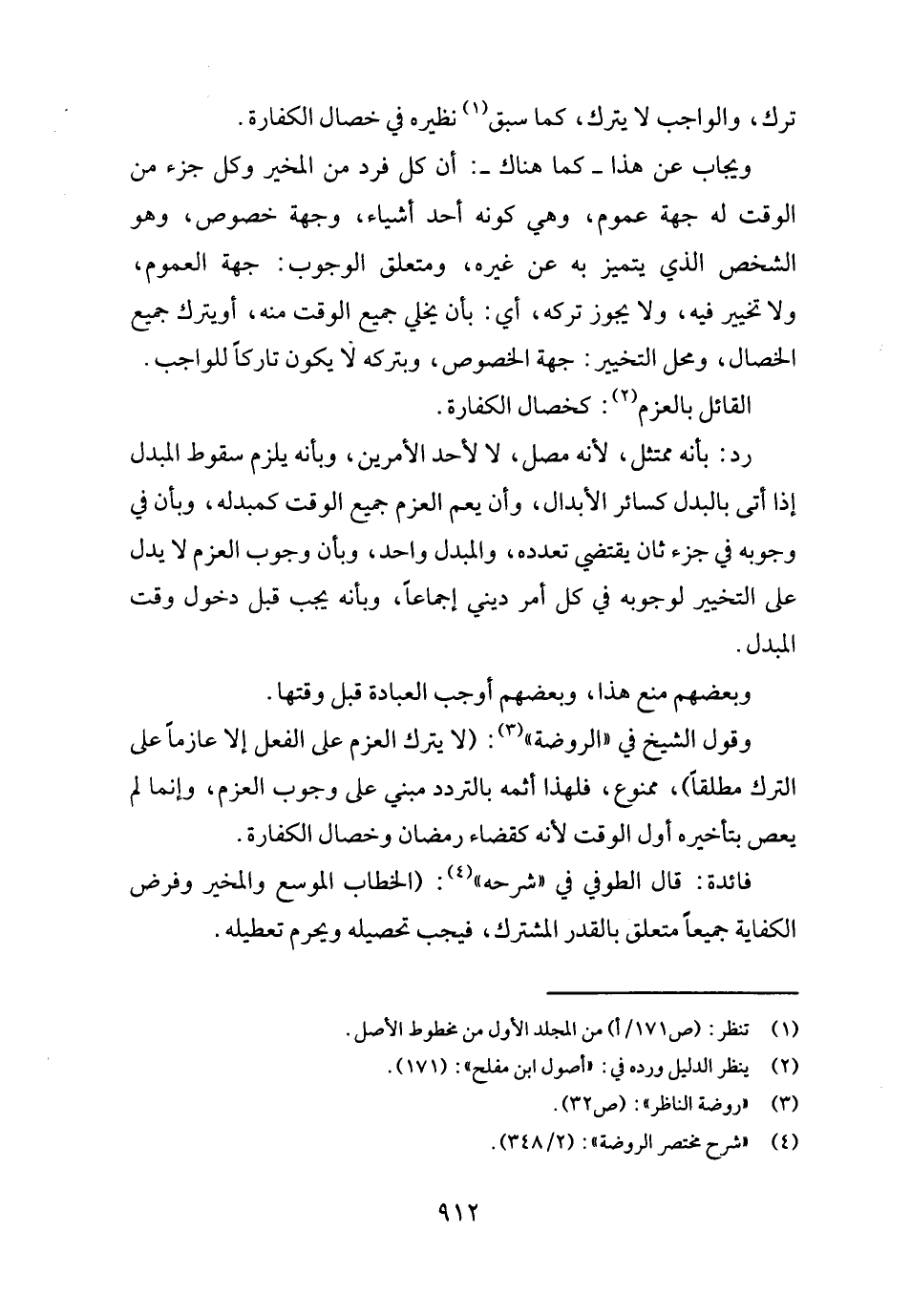 وَقَول الشَّيْخ فِي " الرَّوْضَة ": لَا يتْرك الْعَزْم على الْفِعْل إِلَّا عَازِمًا على التّرْك مُطلقًا) ، مَمْنُوع، فَلهَذَا أثمه بالتردد مَبْنِيّ على وجوب الْعَزْم، وَإِنَّمَا لم يعْص بِتَأْخِيرِهِ أول الْوَقْت لِأَنَّهُ كقضاء رَمَضَان وخصال الْكَفَّارَة.