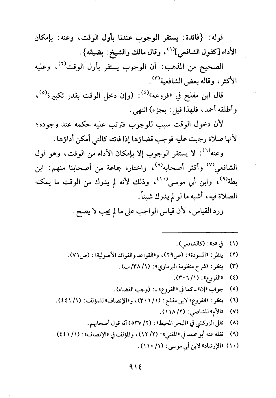 قَوْله: {فَائِدَة: يسْتَقرّ الْوُجُوب عندنَا بِأول الْوَقْت، وَعنهُ: بِإِمْكَان الْأَدَاء [كَقَوْل الشَّافِعِي] ، وَقَالَ مَالك وَالشَّيْخ: بضيقه} .