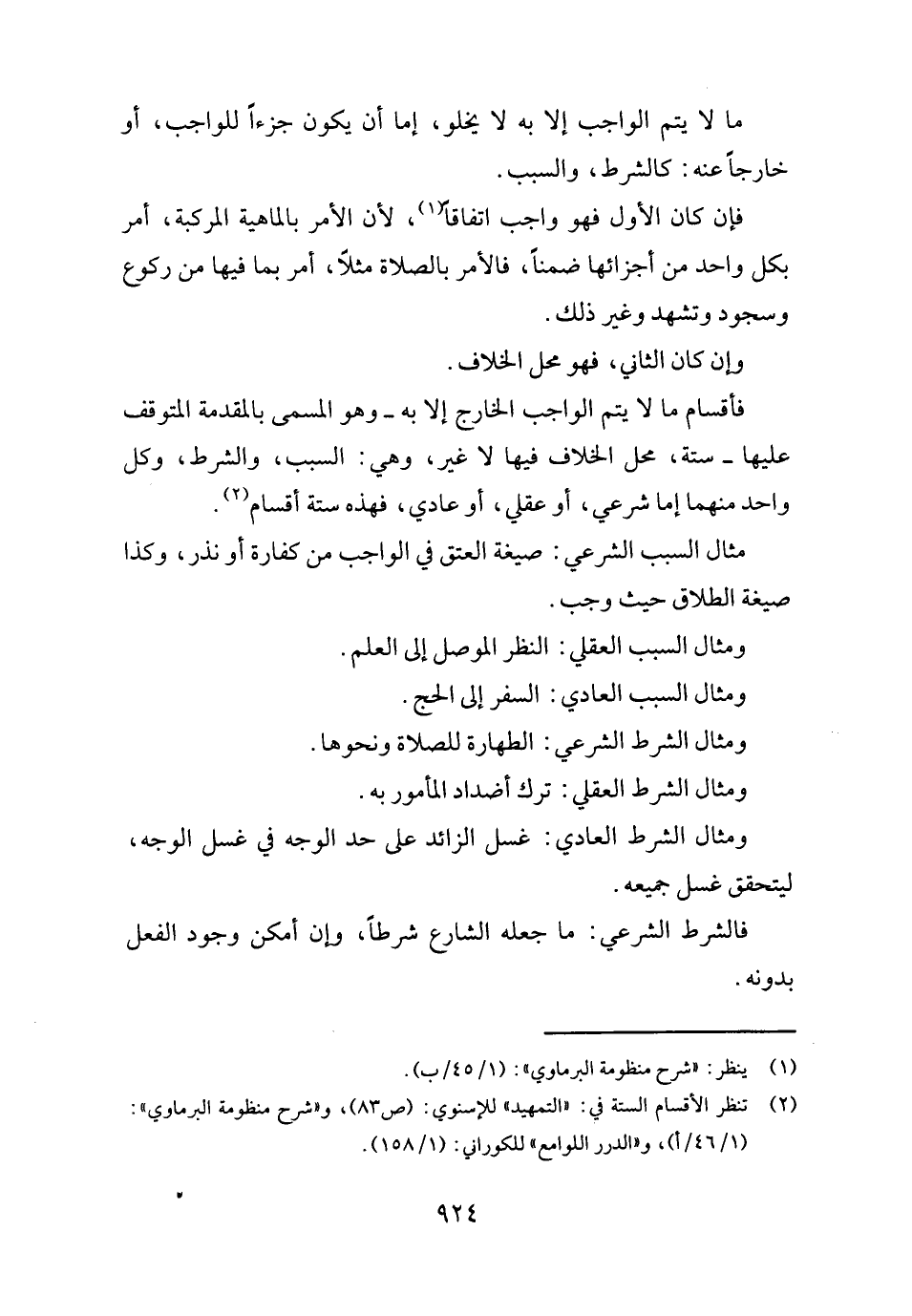 فأقسام مَا لَا يتم الْوَاجِب الْخَارِج إِلَّا بِهِ وَهُوَ الْمُسَمّى بالمقدمة المتوقف عَلَيْهَا سِتَّة، مَحل الْخلاف فِيهَا لَا غير، وَهِي: السَّبَب، وَالشّرط، وكل وَاحِد مِنْهُمَا إِمَّا شَرْعِي، أَو عَقْلِي، أَو عادي، فَهَذِهِ سِتَّة أَقسَام.