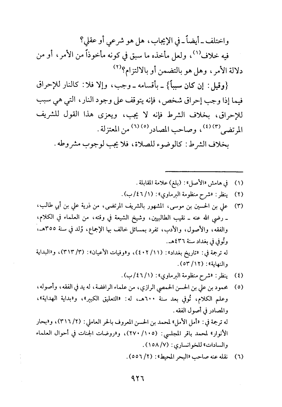 {وَقيل: إِن كَانَ سَببا} بأقسامه وَجب، وَإِلَّا فَلَا: كالنار للإحراق فِيمَا إِذا وَجب إحراق شخص، فَإِنَّهُ يتَوَقَّف على وجود النَّار، الَّتِي هِيَ سَبَب للإحراق، بِخِلَاف الشَّرْط فَإِنَّهُ لَا يجب، ويعزى هَذَا القَوْل للشريف المرتضى، وَصَاحب المصادر من الْمُعْتَزلَة.