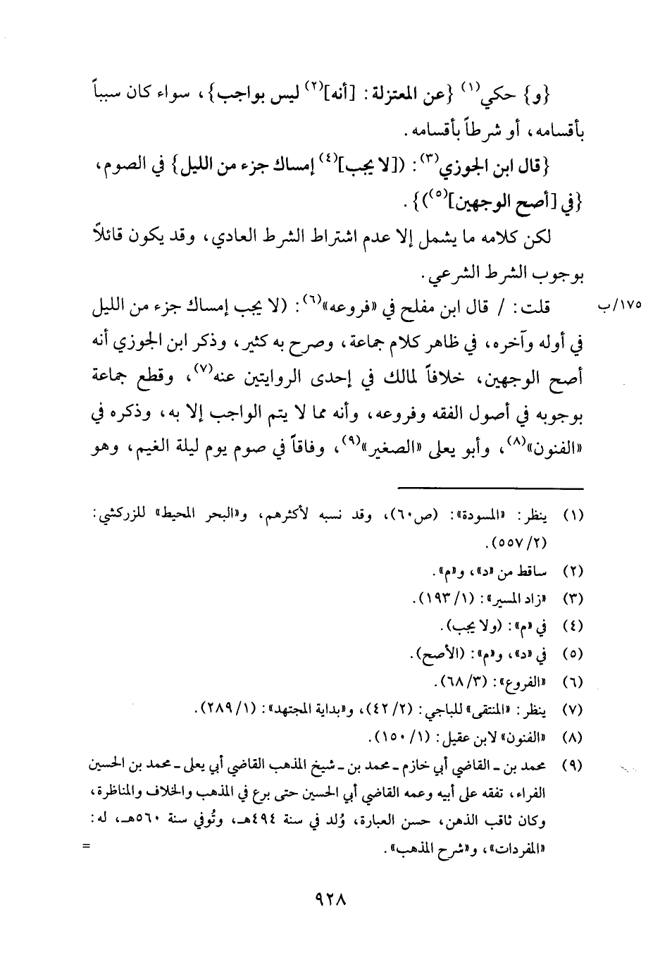قلت: قَالَ ابْن مُفْلِح فِي " فروعه ": (لَا يجب إمْسَاك جُزْء من اللَّيْل فِي أَوله وَآخره، فِي ظَاهر كَلَام جمَاعَة، وَصرح بِهِ كثير، وَذكر ابْن الْجَوْزِيّ أَنه أصح الْوَجْهَيْنِ، خلافًا لمَالِك فِي إِحْدَى الرِّوَايَتَيْنِ عَنهُ، وَقطع جمَاعَة بِوُجُوبِهِ فِي أصُول الْفِقْه وفروعه، وَأَنه مِمَّا لَا يتم الْوَاجِب إِلَّا بِهِ، وَذكره فِي " الْفُنُون "، وَأَبُو يعلى " الصَّغِير "، وفَاقا فِي صَوْم يَوْم لَيْلَة الْغَيْم، وَهُوَ