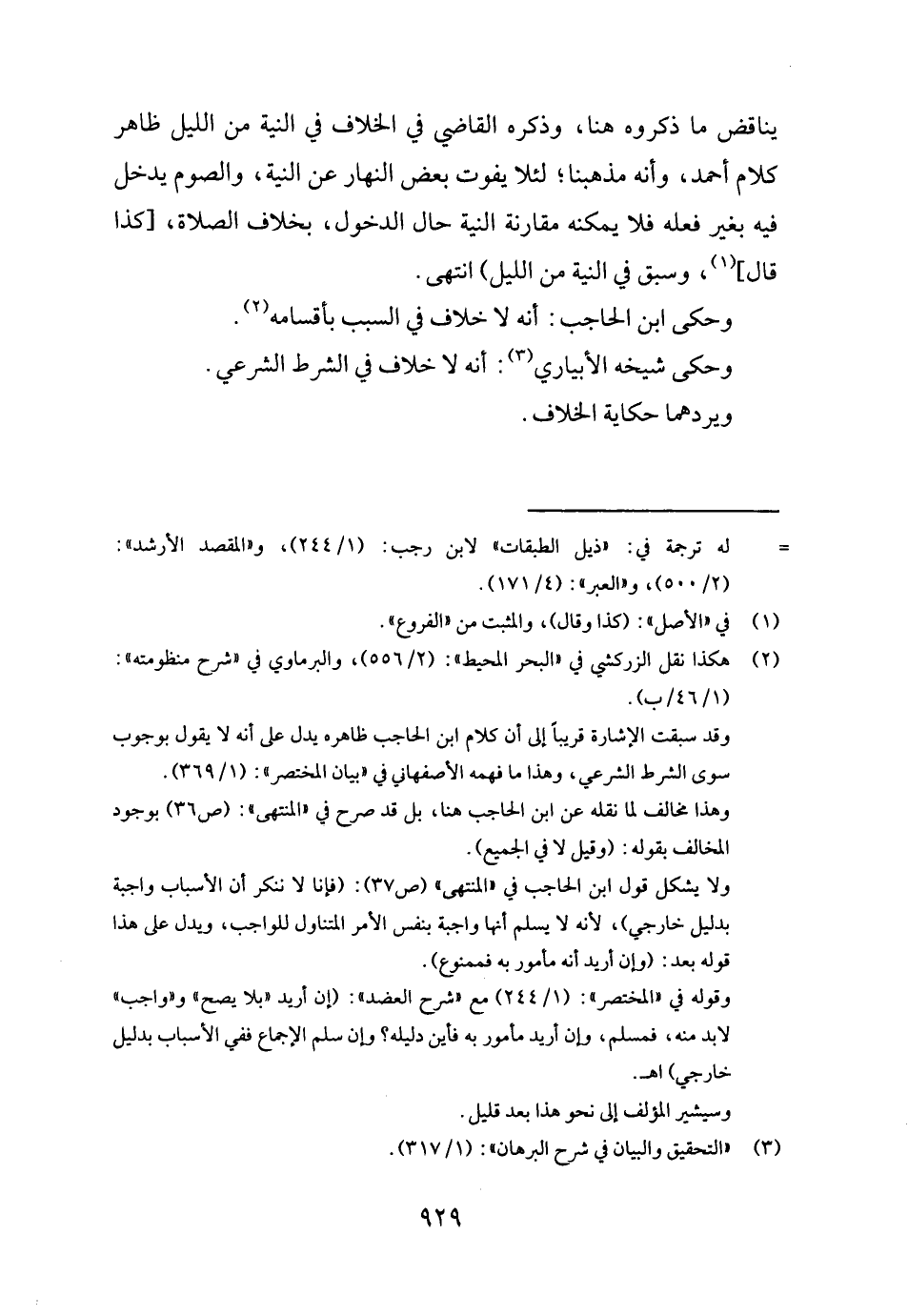 يُنَاقض مَا ذَكرُوهُ هُنَا، وَذكره القَاضِي فِي الْخلاف فِي النِّيَّة من اللَّيْل ظَاهر كَلَام أَحْمد، وَأَنه مَذْهَبنَا؛ لِئَلَّا يفوت بعض النَّهَار عَن النِّيَّة، وَالصَّوْم يدْخل فِيهِ بِغَيْر فعله فَلَا يُمكنهُ مُقَارنَة النِّيَّة حَال الدُّخُول، بِخِلَاف الصَّلَاة، [كَذَا قَالَ] ، وَسبق فِي النِّيَّة من اللَّيْل) انْتهى.