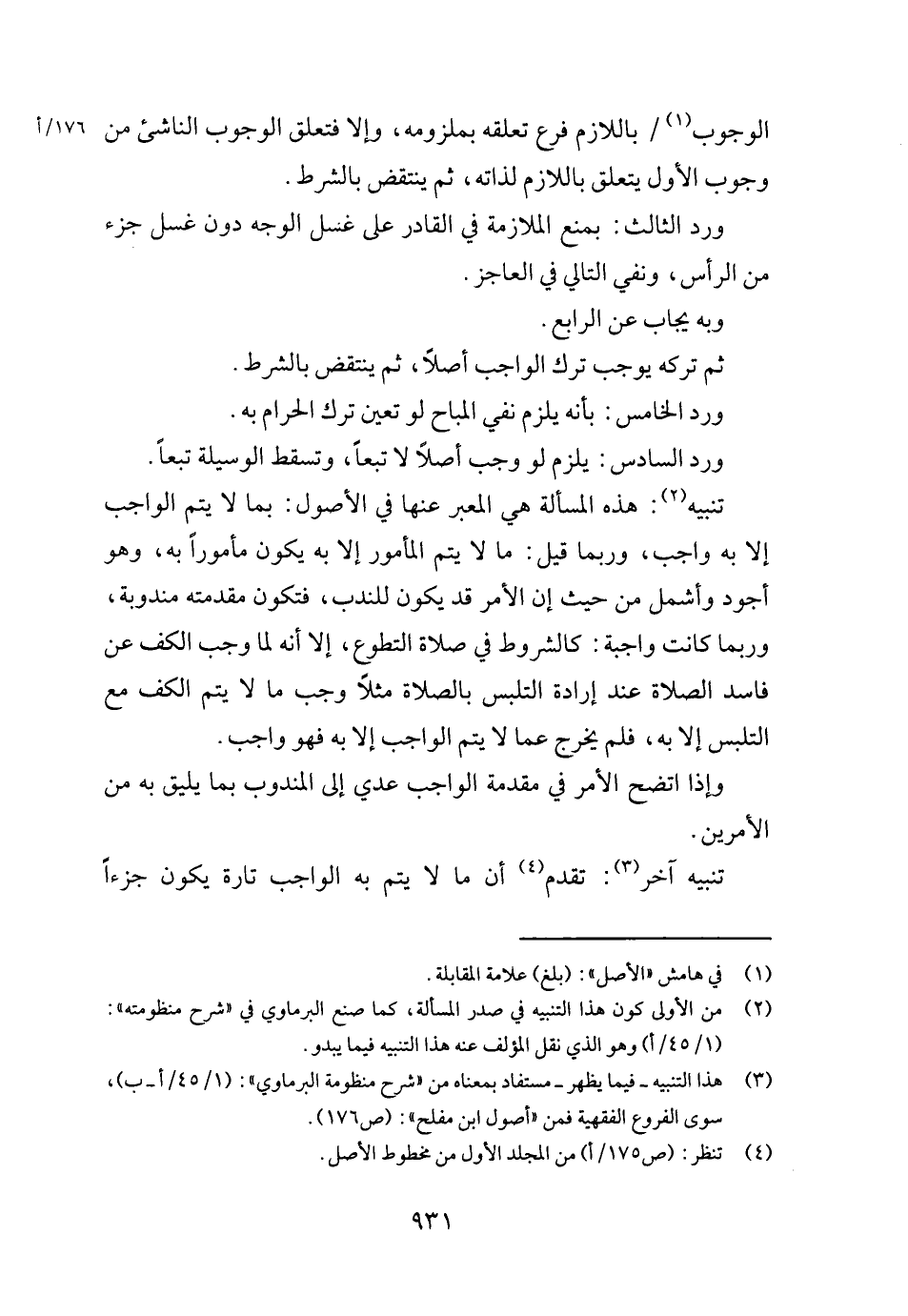 الْوُجُوب باللازم فرع تعلقه بملزومه، وَإِلَّا فَتعلق الْوُجُوب النَّاشِئ من وجوب الأول يتَعَلَّق باللازم لذاته، ثمَّ ينْتَقض بِالشّرطِ.