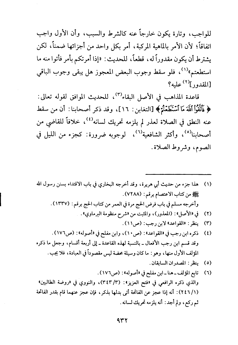 للْوَاجِب، وَتارَة يكون خَارِجا عَنهُ كالشرط وَالسَّبَب، وَأَن الأول وَاجِب اتِّفَاقًا؛ لِأَن الْأَمر بالماهية المركبة، أَمر بِكُل وَاحِد من أَجْزَائِهَا ضمنا، لَكِن يشْتَرط أَن يكون مَقْدُورًا لَهُ، قطعا، للْحَدِيث: " إِذا أَمرتكُم بِأَمْر فَأتوا مِنْهُ مَا اسْتَطَعْتُم "، فَلَو سقط وجوب الْبَعْض المعجوز هَل يبْقى وجوب الْبَاقِي [الْمَقْدُور] عَلَيْهِ؟