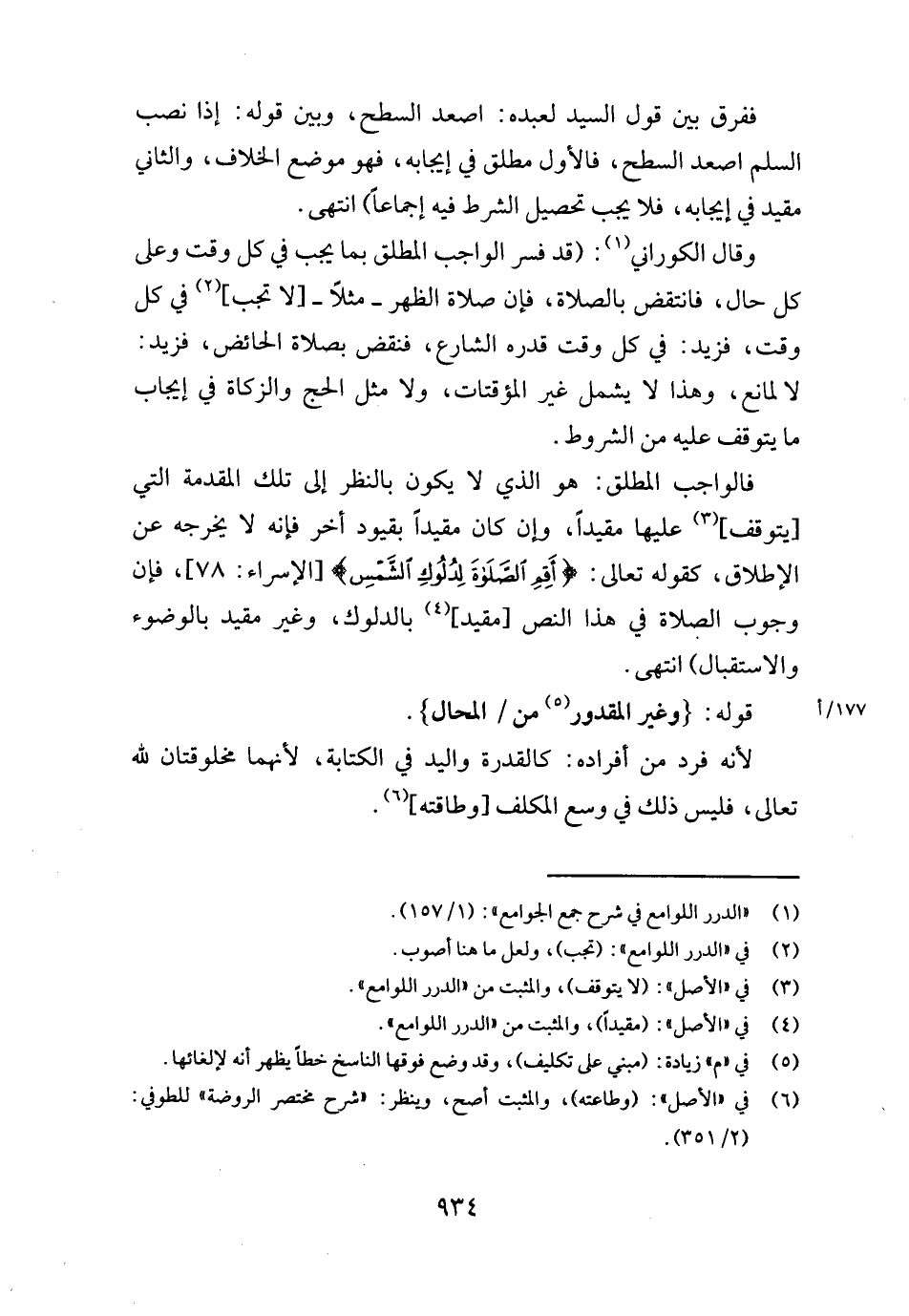 وَقَالَ الكوراني: (قد فسر الْوَاجِب الْمُطلق بِمَا يجب فِي كل وَقت وعَلى كل حَال، فَانْتقضَ بِالصَّلَاةِ، فَإِن صَلَاة الظّهْر مثلا [لَا تجب] فِي كل وَقت، فزيد: فِي كل وَقت قدره الشَّارِع، فنقض بِصَلَاة الْحَائِض فزيد: لَا لمَانع، وَهَذَا لَا يَشْمَل غير المؤقتات، وَلَا مثل الْحَج وَالزَّكَاة فِي إِيجَاب مَا يتَوَقَّف عَلَيْهِ من الشُّرُوط.