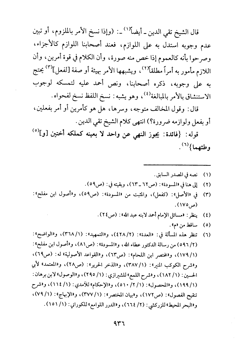 قَالَ: وَقَول الْمُخَالف مُتَوَجّه، وسرها، هَل هُوَ كأمرين أَو أَمر بفعلين، أَو بِفعل ولوازمه ضَرُورَة؟) انْتهى كَلَام الشَّيْخ تَقِيّ الدّين.