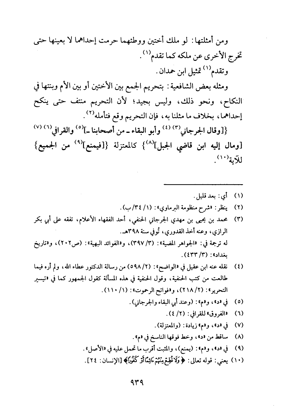 وَمثله بعض الشَّافِعِيَّة: بِتَحْرِيم الْجمع بَين الْأُخْتَيْنِ أَو بَين الْأُم وبنتها فِي النِّكَاح، وَنَحْو ذَلِك، وَلَيْسَ بجيد، لِأَن التَّحْرِيم مُنْتَفٍ حَتَّى ينْكح إِحْدَاهمَا، بِخِلَاف مَا مثلنَا بِهِ، فَإِن التَّحْرِيم وَقع فَتَأَمّله.