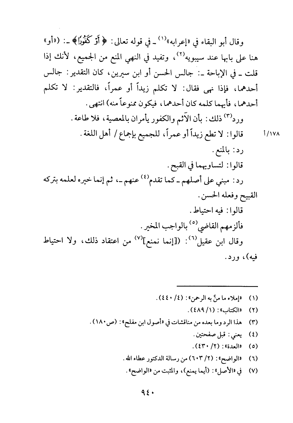 وَقَالَ أبوالبقاء فِي " إعرابه " فِي قَوْله تَعَالَى: {أَو كفوراً} -: (" أَو " هُنَا على بَابهَا عِنْد سِيبَوَيْهٍ، وتفيد فِي النَّهْي الْمَنْع من الْجَمِيع، لِأَنَّك إِذا قلت فِي الْإِبَاحَة -: جَالس الْحسن أَو ابْن سِيرِين، كَانَ التَّقْدِير: جَالس أَحدهمَا فَإِذا نهى فَقَالَ: لَا تكلم زيدا أَو عمرا، فالتقدير: لَا تكلم أَحدهمَا، فَأَيّهمَا كَلمه كَانَ أَحدهمَا، فَيكون مَمْنُوعًا مِنْهُ) انْتهى.