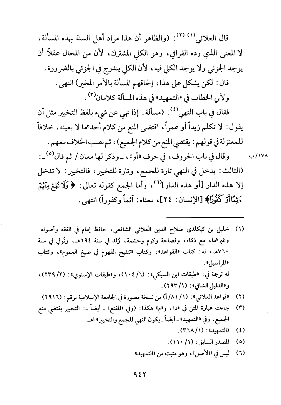 قَالَ العلائي: (وَالظَّاهِر أَن هَذَا مُرَاد أهل السّنة بِهَذِهِ الْمَسْأَلَة، لَا الْمَعْنى الَّذِي رده الْقَرَافِيّ، وَهُوَ الْكُلِّي الْمُشْتَرك، لِأَن من الْمحَال عقلا أَن يُوجد الجزئي وَلَا يُوجد الْكُلِّي فِيهِ لِأَن الكلى ينْدَرج فِي الجزئي بِالضَّرُورَةِ قَالَ: لَكِن يشكل على هَذَا، إلحاقهم الْمَسْأَلَة بِالْأَمر الْمُخَير) انْتهى.