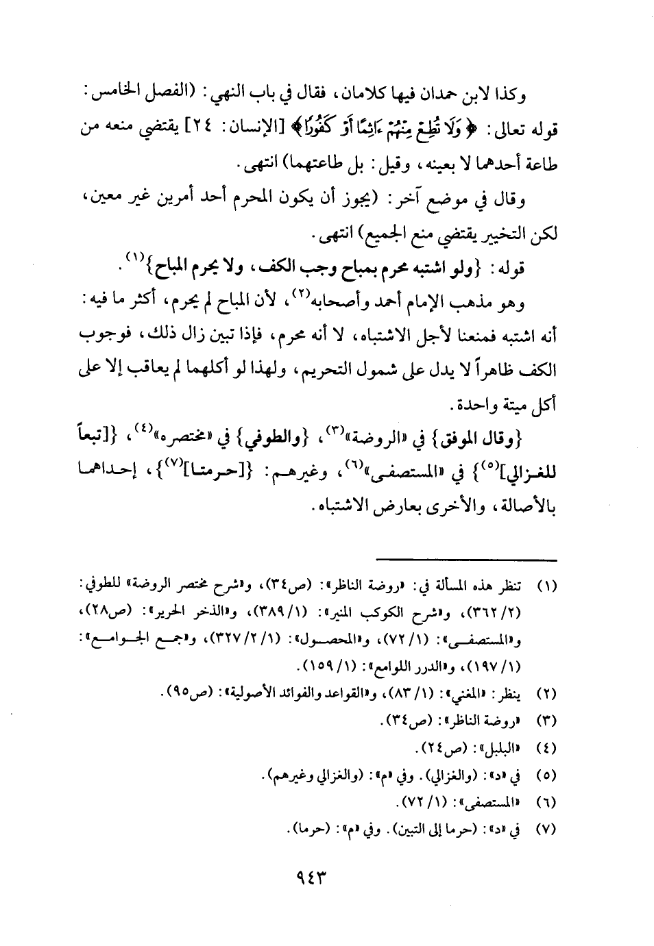 وَكَذَا لِابْنِ حمدَان فِيهَا كلامان، فَقَالَ فِي بَاب النَّهْي: (الْفَصْل الْخَامِس: قَوْله تَعَالَى: {وَلَا تُطِع مِنْهُم ءاثماً أَو كفوراً} [الْإِنْسَان: ٢٤] يَقْتَضِي مَنعه من طَاعَة أَحدهمَا لَا بِعَيْنِه، وَقيل: بل طاعتهما) انْتهى. وَقَالَ فِي مَوضِع آخر: يجوز أَن يكون الْمحرم أحد أَمريْن غير معِين، لَكِن التَّخْيِير بقتضي منع الْجَمِيع) انْتهى. قَوْله: {وَلَو اشْتبهَ محرم بمباح وَجب الْكَفّ، وَلَا يحرم الْمُبَاح} .