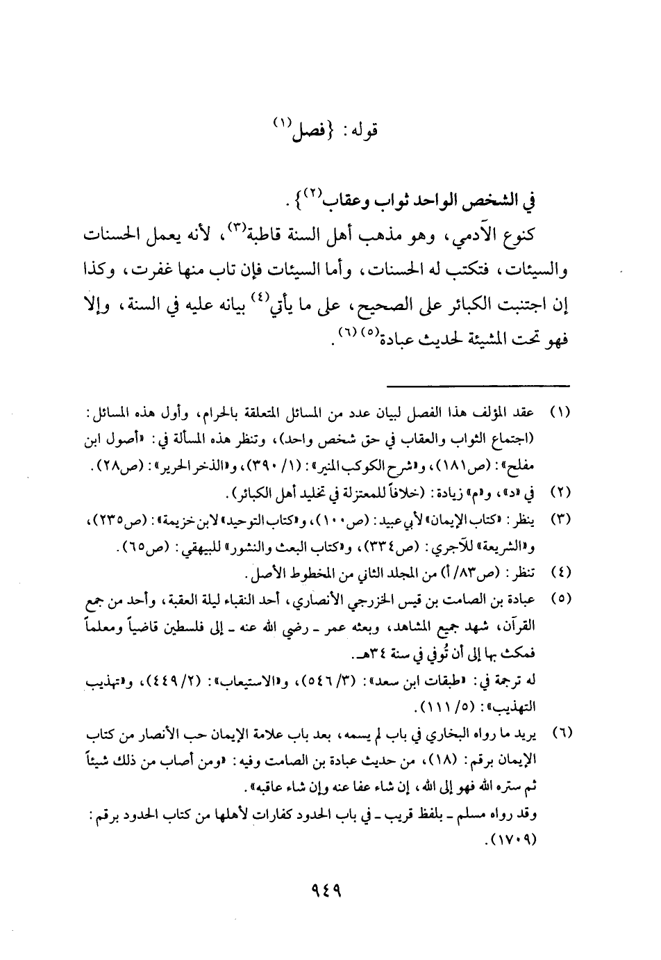 قَوْله: [فصل فِي الشَّخْص الْوَاحِد ثَوَاب وعقاب} .
