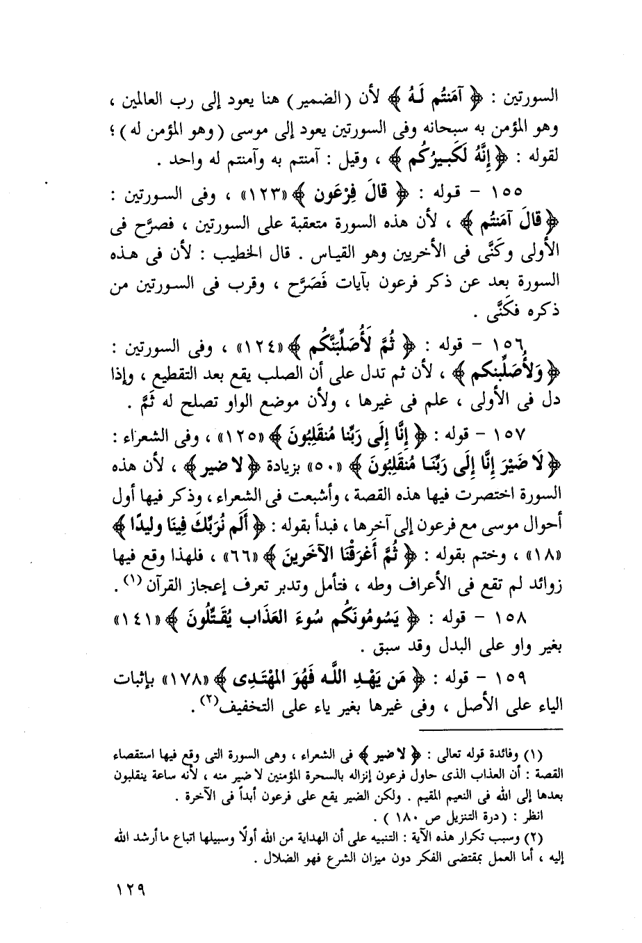 157 - قَوْله {إِنَّا إِلَى رَبنَا منقلبون} وَفِي الشُّعَرَاء {لَا ضير إِنَّا إِلَى رَبنَا منقلبون} بِزِيَادَة {لَا ضير} لِأَن هَذِه السُّورَة اختصرت فِيهَا هَذِه الْقِصَّة وأشبعت فِي الشُّعَرَاء وَذكر فِيهَا أول أَحْوَال مُوسَى مَعَ فِرْعَوْن إِلَى آخرهَا فَبَدَأَ بقوله {ألم نربك فِينَا وليدا} وَختم بقوله {ثمَّ أغرقنا الآخرين} فَلهَذَا وَقع فِيهَا زَوَائِد لم تقع فِي الْأَعْرَاف وطه فَتَأمل وتدبر تعرف إعجاز الْقُرْآن