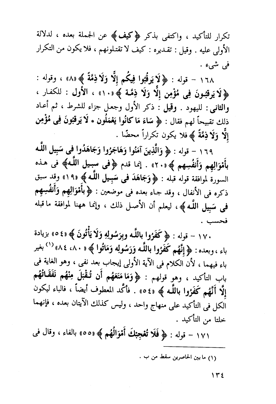 170 - قَوْله {كفرُوا بِاللَّه وبرسوله وَلَا يأْتونَ} بِزِيَادَة بَاء وَبعده {إِنَّهُم كفرُوا بِاللَّه وَرَسُوله وماتوا} بِغَيْر بَاء فيهمَا لِأَن الْكَلَام فِي الْآيَة الأولى إِيجَاب بعد نفي وَهُوَ الْغَايَة فِي بَاب التَّأْكِيد وَهُوَ قَوْلهم {وَمَا مَنعهم أَن تقبل مِنْهُم نفقاتهم إِلَّا أَنهم كفرُوا بِاللَّه} فأكد الْمَعْطُوف أَيْضا فالباء ليَكُون الْكل فِي التَّأْكِيد على منهاج وَاحِد وَلَيْسَ كَذَلِك الْآيَتَانِ بعده فَإِنَّهُمَا خلتا من التَّأْكِيد