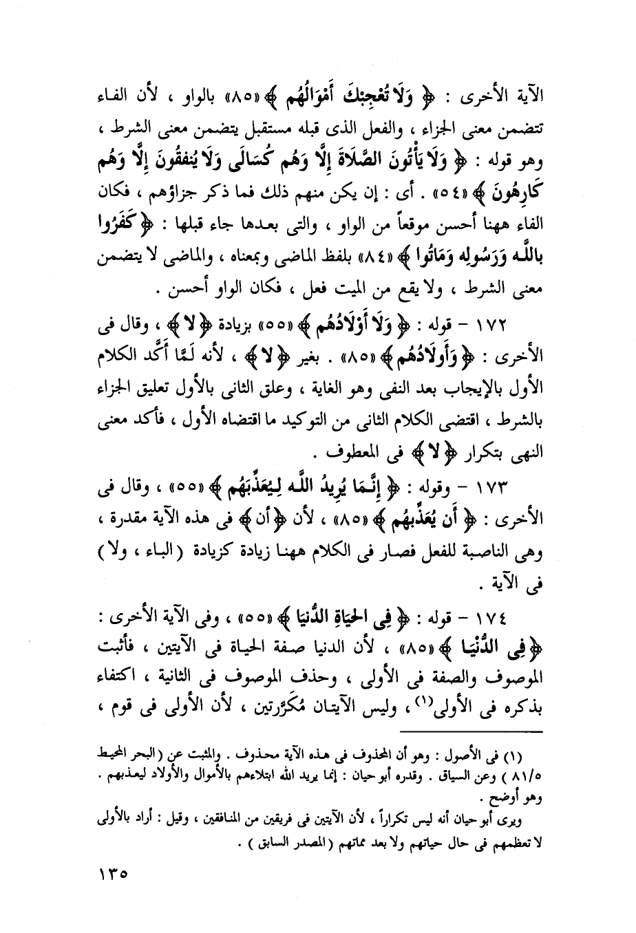 172 - قَوْله {وَلَا أَوْلَادهم} بِزِيَادَة {لَا} وَقَالَ فِي الْأُخْرَى {وَأَوْلَادهمْ} بِغَيْر لَا لِأَنَّهُ لما أكد الْكَلَام الأول بِالْإِيجَابِ بعد النَّفْي وَهُوَ الْغَايَة وعلق الثَّانِي بِالْأولِ تَعْلِيق الْجَزَاء بِالشّرطِ اقْتضى الْكَلَام الثَّانِي من التوكيد مَا اقْتَضَاهُ الأول فأكد معنى النَّهْي بتكرار {لَا} فِي الْمَعْطُوف
