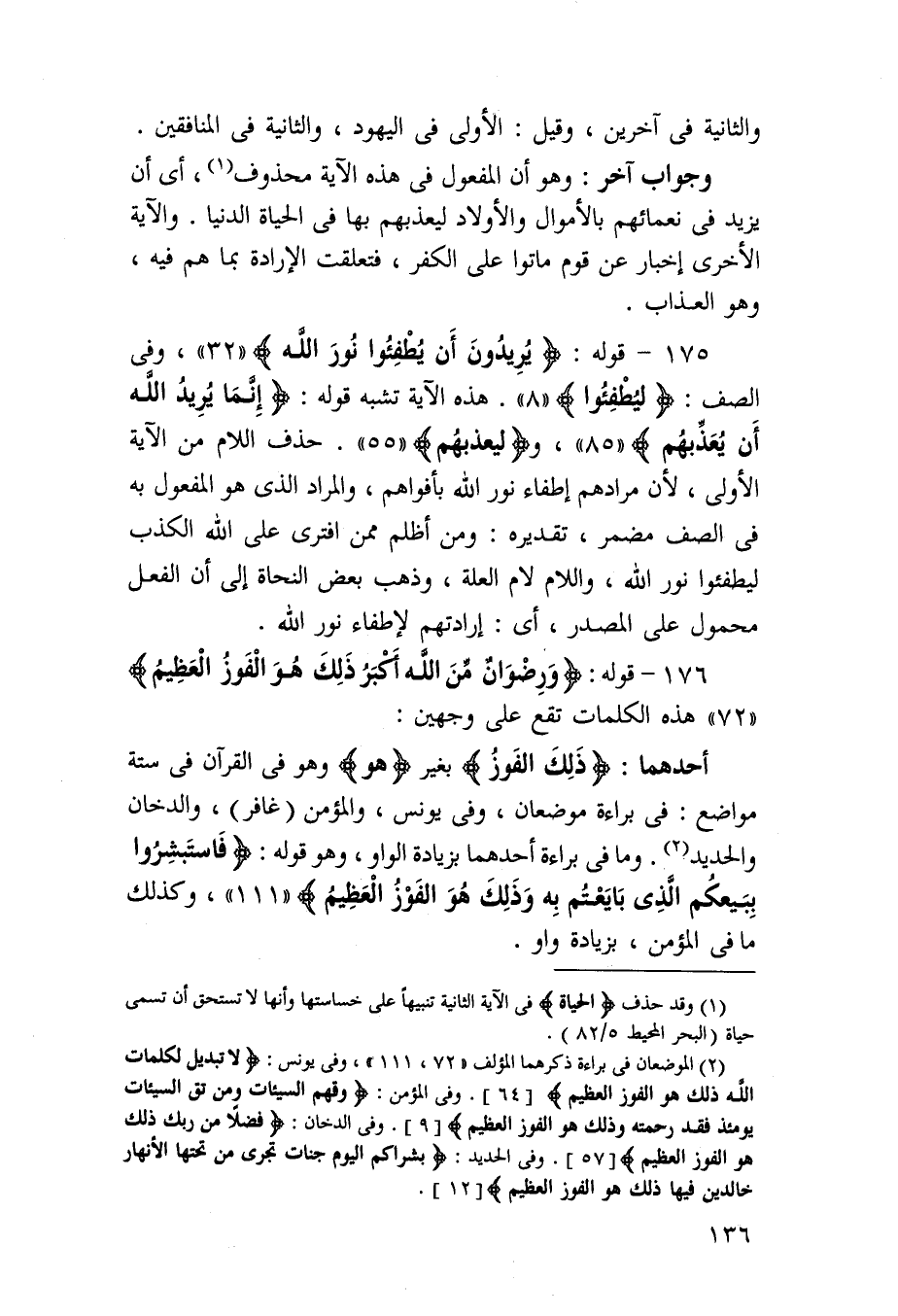 176 - قَوْله {ورضوان من الله أكبر ذَلِك هُوَ الْفَوْز الْعَظِيم} هَذِه الْكَلِمَات تقع على وَجْهَيْن أَحدهمَا {ذَلِك الْفَوْز} بِغَيْر {هُوَ} وَهُوَ فِي الْقُرْآن فِي سِتَّة مَوَاضِع فِي بَرَاءَة موضعان وَفِي يُونُس وَالْمُؤمن وَالدُّخَان وَالْحَدِيد وَمَا فِي بَرَاءَة أَحدهمَا بِزِيَادَة الْوَاو وَهُوَ قَوْله {فاستبشروا ببيعكم الَّذِي بايعتم بِهِ وَذَلِكَ هُوَ الْفَوْز الْعَظِيم} وَكَذَلِكَ مَا فِي الْمُؤمن بِزِيَادَة الْوَاو