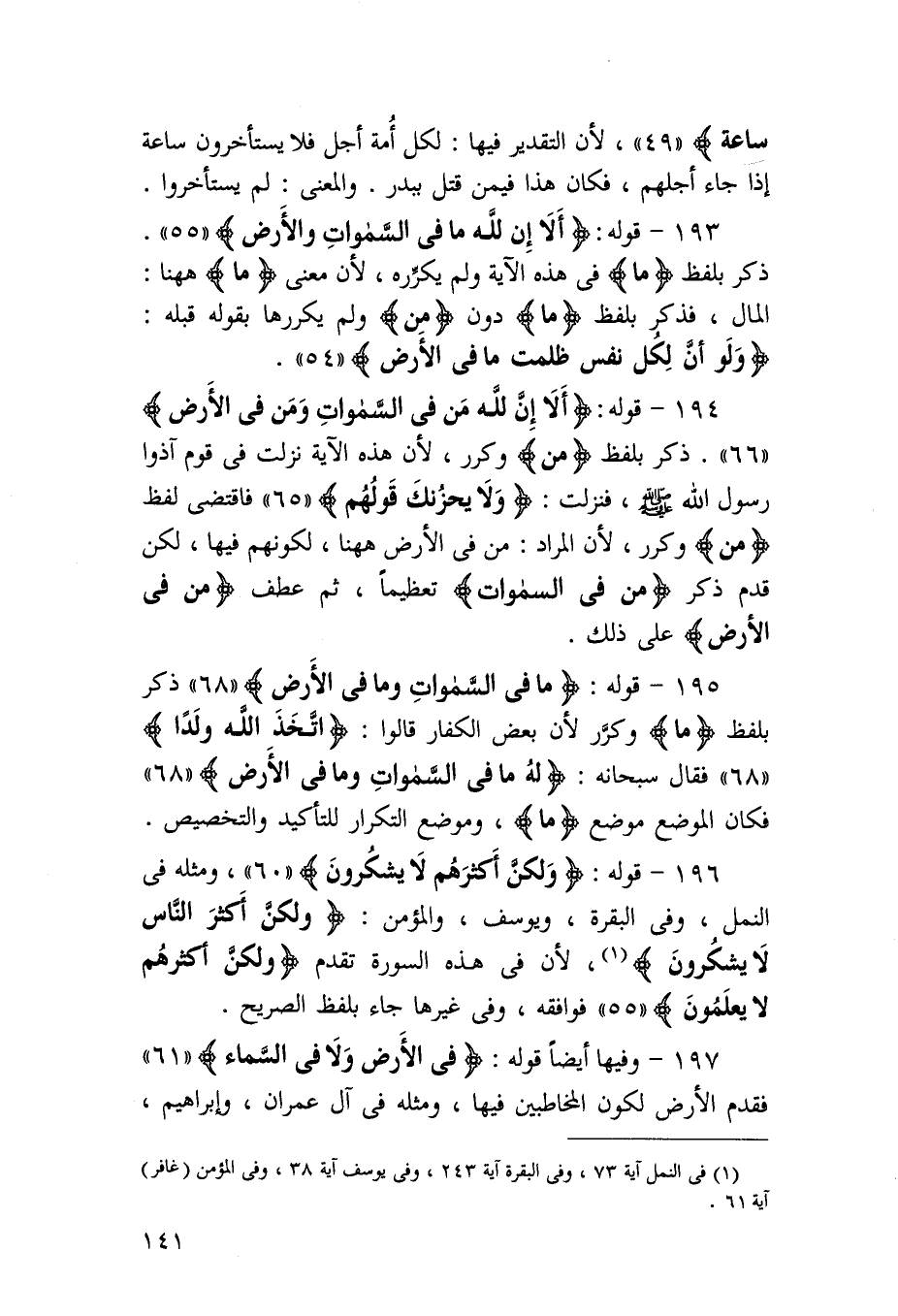 193 - قَوْله {أَلا إِن لله مَا فِي السَّمَاوَات وَالْأَرْض} ذكر بِلَفْظ {مَا} فِي هَذِه الْآيَة وَلم يكرره لِأَن معنى {مَا} هَهُنَا المَال فَذكر بِلَفْظ {مَا} دون {من} وَلم يكررها اكْتِفَاء بقوله قبله {وَلَو أَن لكل نفس ظلمت مَا فِي الأَرْض}