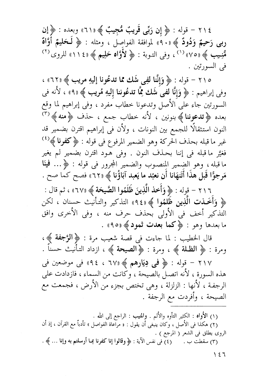 215 - قَوْله {وإننا لفي شكّ مِمَّا تدعونا إِلَيْهِ مريب} وَفِي إِبْرَاهِيم {وَإِنَّا لفي شكّ مِمَّا تدعوننا إِلَيْهِ مريب} لِأَنَّهُ فِي السورتين جَاءَ على الأَصْل وتدعونا خطاب مُفْرد وَفِي إِبْرَاهِيم لما وَقع بعده {تدعوننا} بنونين لِأَنَّهُ