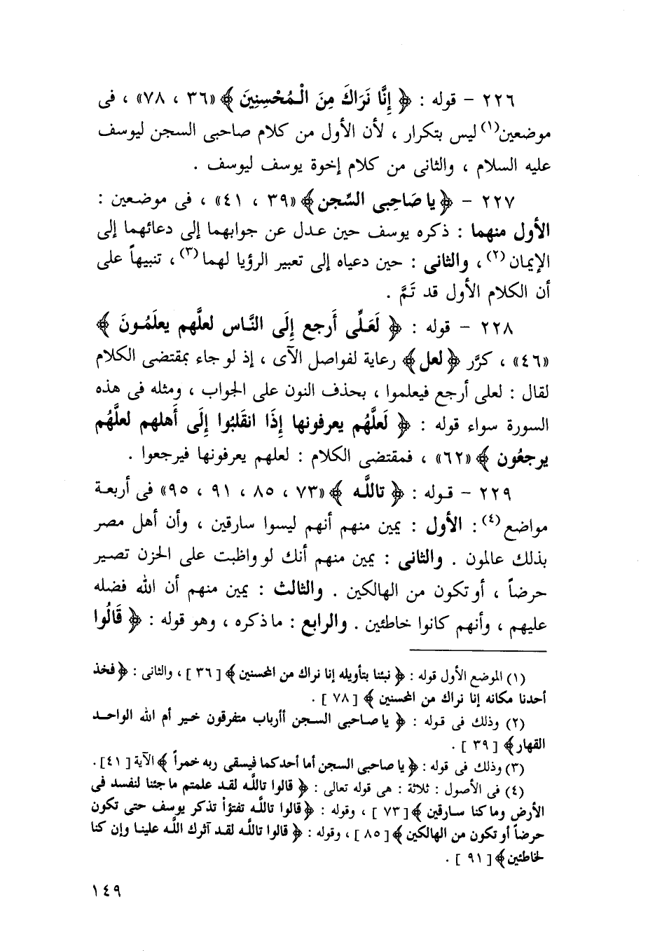227 - قَوْله {يَا صَاحِبي السجْن} فِي موضِعين الأول مِنْهُمَا ذكره يُوسُف حِين عدل عَن جوابهما إِلَى دعائهما إِلَى الْإِيمَان وَالثَّانِي حِين دعياه إِلَى تَعْبِير الرُّؤْيَا لَهما تَنْبِيها على أَن الْكَلَام الأول قد تمّ