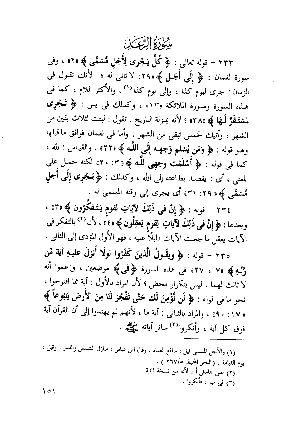 233 - قَوْله تَعَالَى {كل يجْرِي لأجل مُسَمّى} وَفِي سُورَة لُقْمَان {إِلَى أجل} لَا ثَانِي لَهُ لِأَنَّك تَقول فِي الزَّمَان جرى ليَوْم كَذَا وَإِلَى يَوْم كَذَا وَالْأَكْثَر اللَّام كَمَا فِي هَذِه السُّورَة وَسورَة الْمَلَائِكَة 13 وَكَذَلِكَ فِي يس {تجْرِي لمستقر لَهَا} لِأَنَّهُ بِمَنْزِلَة التَّارِيخ تَقول لَبِثت لثلاث بَقينَ من الشَّهْر وآتيك لخمس تبقى من الشَّهْر وَأما فِي لُقْمَان فَوَافَقَ مَا قبلهَا وَهُوَ قَوْله {وَمن يسلم وَجهه إِلَى الله} وَالْقِيَاس لله كَمَا فِي قَوْله {أسلمت وَجْهي لله} لكنه حمل على الْمَعْنى أَي يقْصد بِطَاعَتِهِ إِلَى الله وَكَذَلِكَ {يجْرِي إِلَى أجل مُسَمّى} أَي يجْرِي إِلَى وقته الْمُسَمّى لَهُ