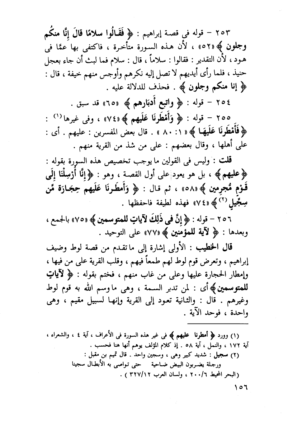 254 - قَوْله فِي قصَّة إِبْرَاهِيم {فَقَالُوا سَلاما قَالَ إِنَّا مِنْكُم وجلون} لِأَن هَذِه السُّورَة مُتَأَخِّرَة فَاكْتفى بهَا عَمَّا فِي هود لِأَن التَّقْدِير فَقَالُوا سَلاما قَالَ سَلام فَمَا لبث أَن جَاءَ بعجل حنيذ فَلَمَّا رأى أَيْديهم لَا تصل إِلَيْهِ نكرهم وأوجس مِنْهُم خيفة قَالَ إِنَّا مِنْكُم وجلون فَحذف للدلالة عَلَيْهِ