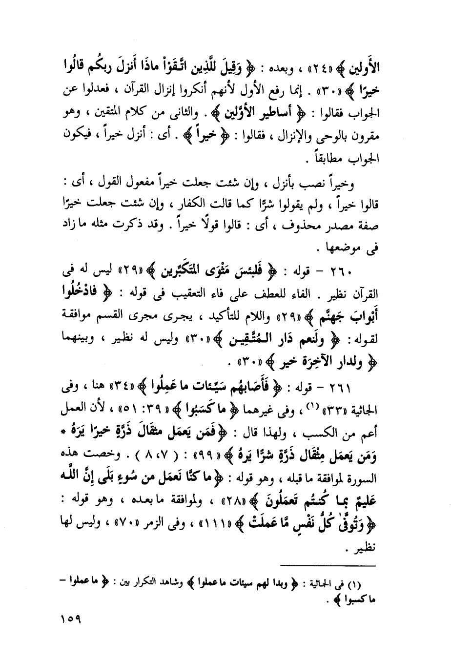 الْأَوَّلين} وَبعده {وَقيل للَّذين اتَّقوا مَاذَا أنزل ربكُم قَالُوا خيرا} إِنَّمَا رفع الأول لأَنهم أَنْكَرُوا إِنْزَال الْقُرْآن فعدلوا عَن الْجَواب فَقَالُوا {أساطير الْأَوَّلين} وَالثَّانِي من كَلَام الْمُتَّقِينَ وهم مقرون بالوحى والإنزال فَقَالُوا {خيرا} أَي أنزل خيرا فَيكون الْجَواب مطابقا