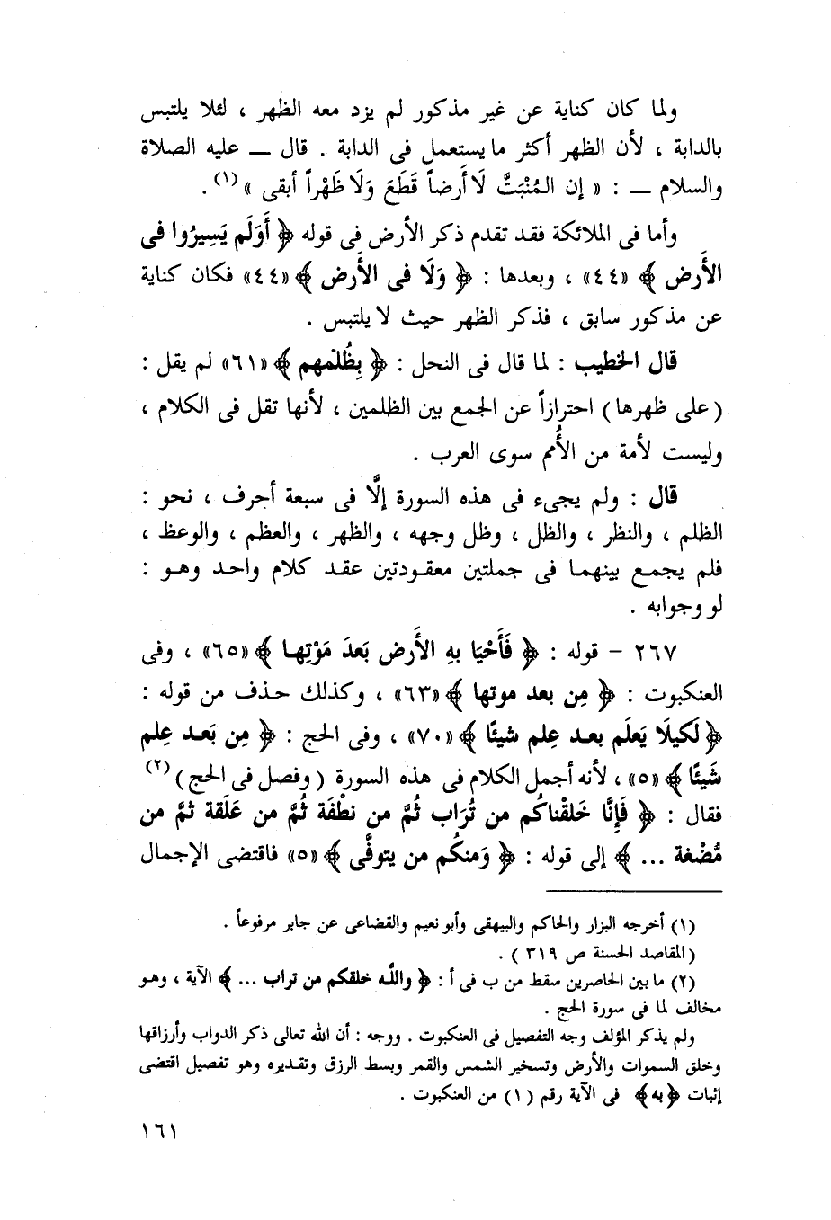 267 - م قَوْله {فأحيا بِهِ الأَرْض بعد مَوتهَا} وَفِي العنكبوت {من بعد مَوتهَا} وَكَذَلِكَ حذف من قَوْله {لكيلا يعلم من بعد علم شَيْئا} وَفِي الْحَج {من بعد علم شَيْئا} لِأَنَّهُ أجمل الْكَلَام فِي هَذِه السُّورَة