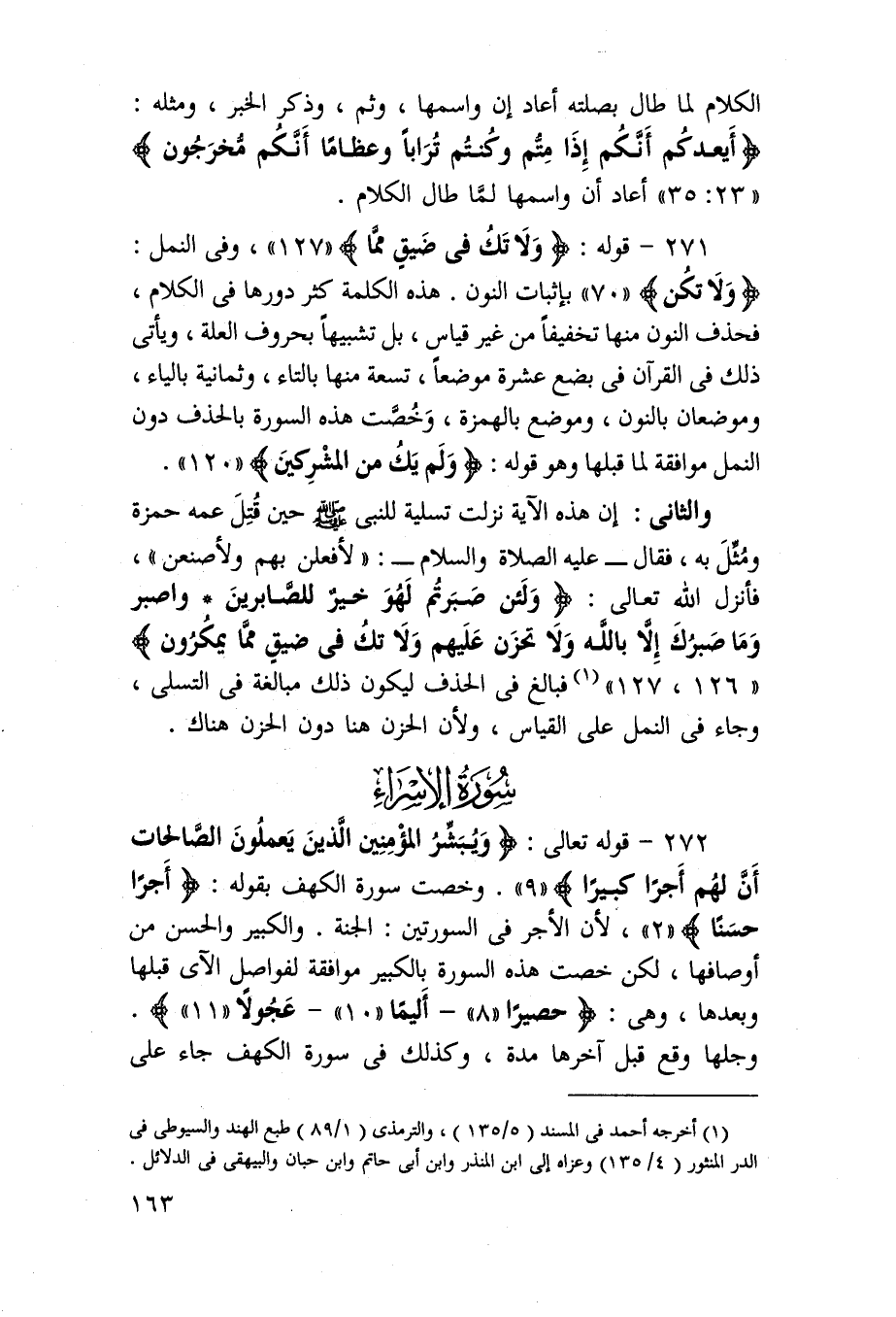 272 - قَوْله تَعَالَى {ويبشر الْمُؤمنِينَ الَّذين يعْملُونَ الصَّالِحَات أَن لَهُم أجرا كَبِيرا} وخصت سُورَة الْكَهْف بقوله {أجرا حسنا} لِأَن الْأجر فِي السورتين الْجنَّة وَالْكَبِير وَالْحسن من أوصافها لَكِن خصت هَذِه السُّورَة بالكبير مُوَافقَة لفواصل الْآي قبلهَا وَبعدهَا وَهِي {حَصِيرا} أَلِيمًا 10 عجولا 11 وجلها وَقع قبل آخرهَا مُدَّة وَكَذَلِكَ فِي سُورَة الْكَهْف جَاءَ على