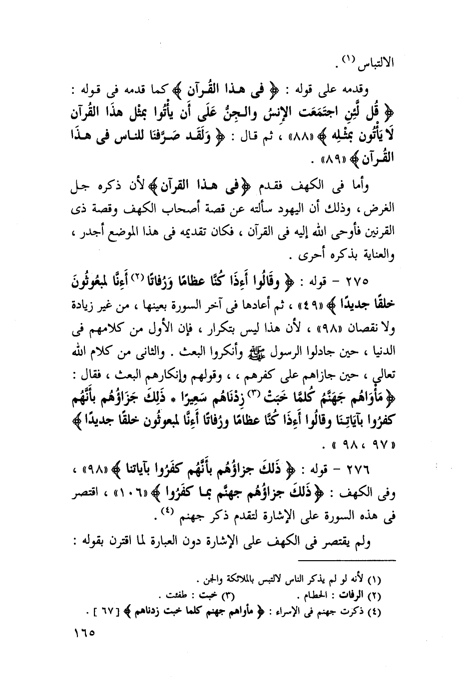 49 - ثمَّ أَعَادَهَا فِي أخر السُّورَة بِعَينهَا من غير زِيَادَة وَلَا نُقْصَان 98 لِأَن هَذَا لَيْسَ بتكرار فَإِن الأول من كَلَامهم فِي الدُّنْيَا حِين جادلوا الرَّسُول وأنكروا الْبَعْث وَالثَّانِي من كَلَام الله تَعَالَى حِين جازاهم على كفرهم وَقَوْلهمْ وإنكارهم الْبَعْث فَقَالَ {مأواهم جَهَنَّم كلما خبت زدناهم سعيرا} {ذَلِك جزاؤهم بِأَنَّهُم كفرُوا بِآيَاتِنَا وَقَالُوا أئذا كُنَّا عظاما ورفاتا أئنا لمبعوثون خلقا جَدِيدا}