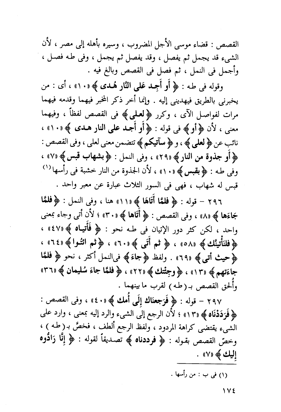 297 - قَوْله {فرجعناك إِلَى أمك} وَفِي الْقَصَص {فرددناه} لِأَن الرجع إِلَى الشَّيْء وَالرَّدّ إِلَيْهِ بِمَعْنى وَالرَّدّ على الشَّيْء يَقْتَضِي كَرَاهَة الْمَرْدُود وَلَفظ الرجع ألطف فَخص بطه وَخص الْقَصَص بقوله {فرددناه} تَصْدِيقًا لقَوْله {إِنَّا رادوه إِلَيْك}