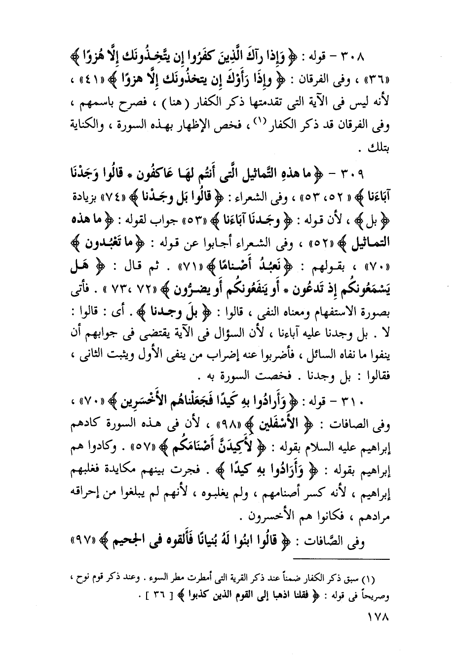 309 - قَوْله {مَا هَذِه التماثيل الَّتِي أَنْتُم لَهَا عاكفون} {قَالُوا وجدنَا آبَاءَنَا} وَفِي الشُّعَرَاء {قَالُوا بل وجدنَا} بِزِيَادَة {بل} لِأَن قَوْله {وجدنَا آبَاءَنَا} جَوَاب لقَوْله {مَا هَذِه التماثيل} وَفِي الشُّعَرَاء أجابوا عَن قَوْله {مَا تَعْبدُونَ} بقَوْلهمْ {نعْبد أصناما} ثمَّ قَالَ {هَل يسمعونكم إِذْ تدعون} {أَو ينفعونكم أَو يضرون} فَأتى بِصُورَة الِاسْتِفْهَام وَمَعْنَاهُ النَّفْي قَالُوا {بل وجدنَا} أَي قَالُوا لَا بل وجدنَا عَلَيْهِ آبَاءَنَا لِأَن السُّؤَال فِي الْآيَة يَقْتَضِي فِي جوابهم أَن ينفوا مَا نَفَاهُ السَّائِل فَأَضْرَبُوا عَنهُ إضراب من يَنْفِي الأول وَيثبت الثَّانِي فَقَالُوا بل وجدنَا فخصت السُّورَة بِهِ