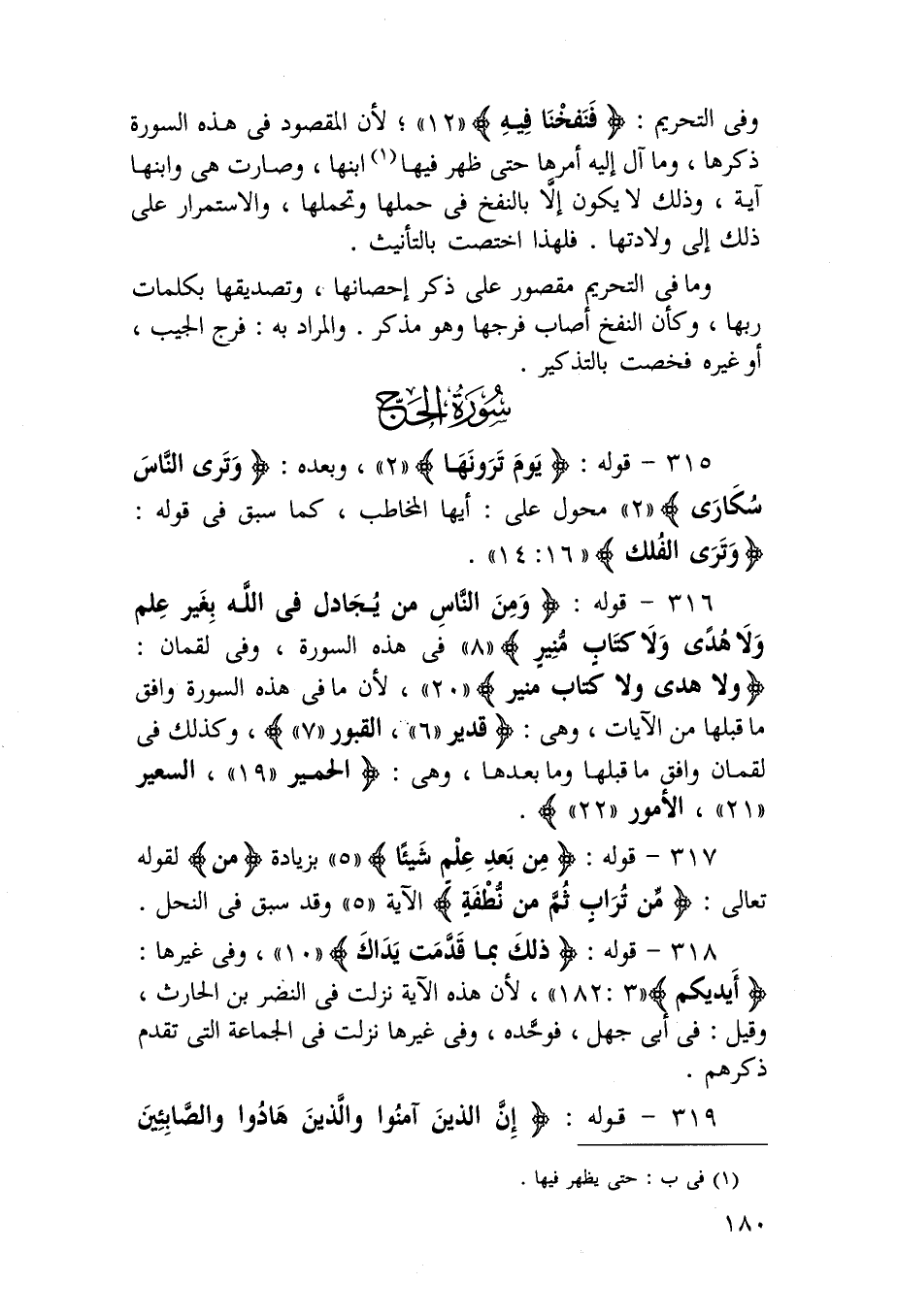 316 - قَوْله {وَمن النَّاس من يُجَادِل فِي الله بِغَيْر علم وَلَا هدى وَلَا كتاب مُنِير} فِي هَذِه السُّورَة وَفِي لُقْمَان {وَلَا هدى وَلَا كتاب مُنِير} لِأَن مَا فِي هَذِه السُّورَة وَافق مَا قبلهَا من الْآيَات وَهِي {قدير} {الْقُبُور} وَكَذَلِكَ فِي لُقْمَان وَافق مَا قبلهَا وَمَا بعْدهَا وَهِي {الْحمير} {السعير} {الْأُمُور}