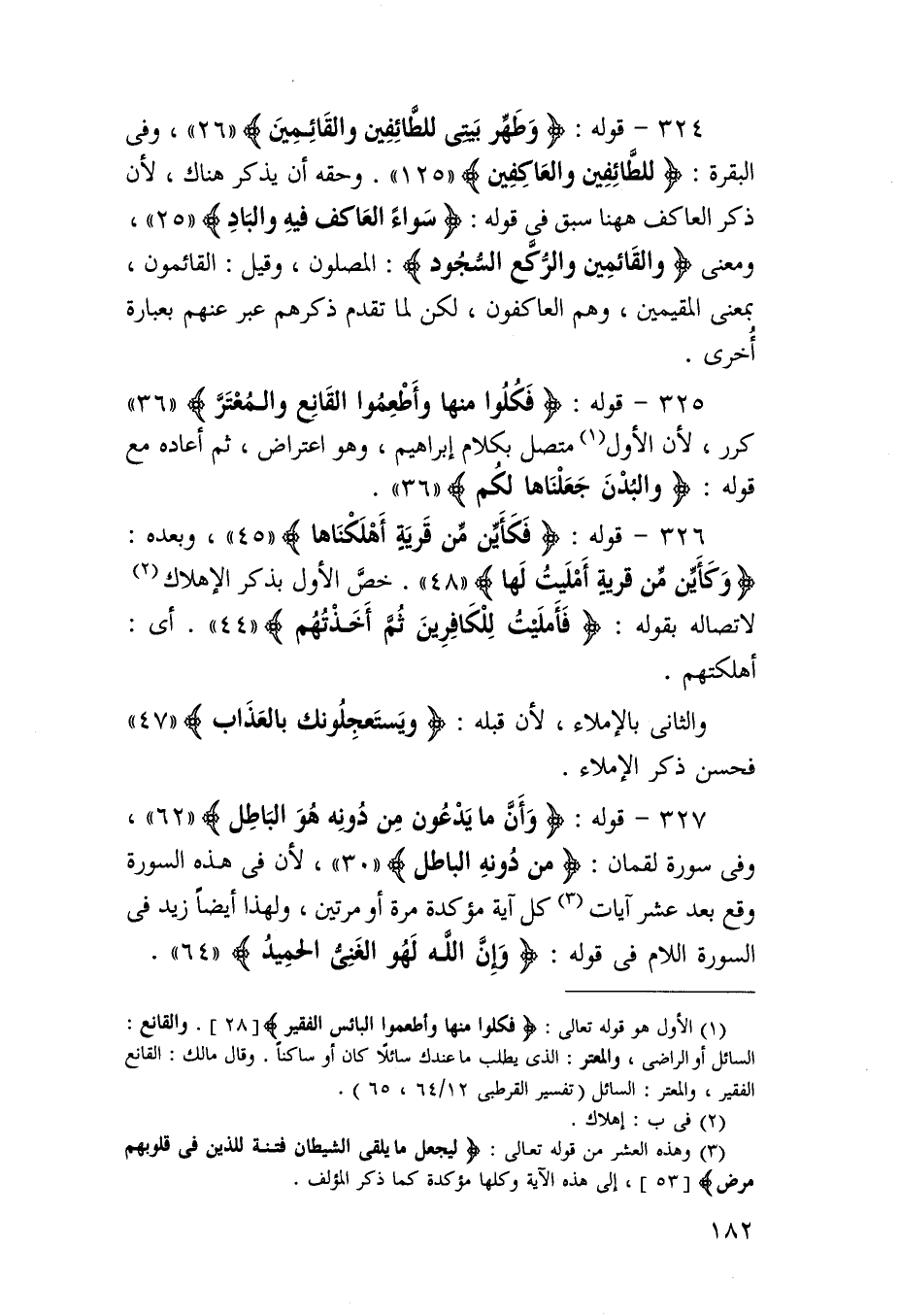325 - قَوْله {فَكُلُوا مِنْهَا وأطعموا القانع والمعتر} كرر لِأَن الأول مُتَّصِل بِكَلَام إِبْرَاهِيم وَهُوَ اعْتِرَاض ثمَّ أَعَادَهُ مَعَ قَوْله {وَالْبدن جعلناها لكم}