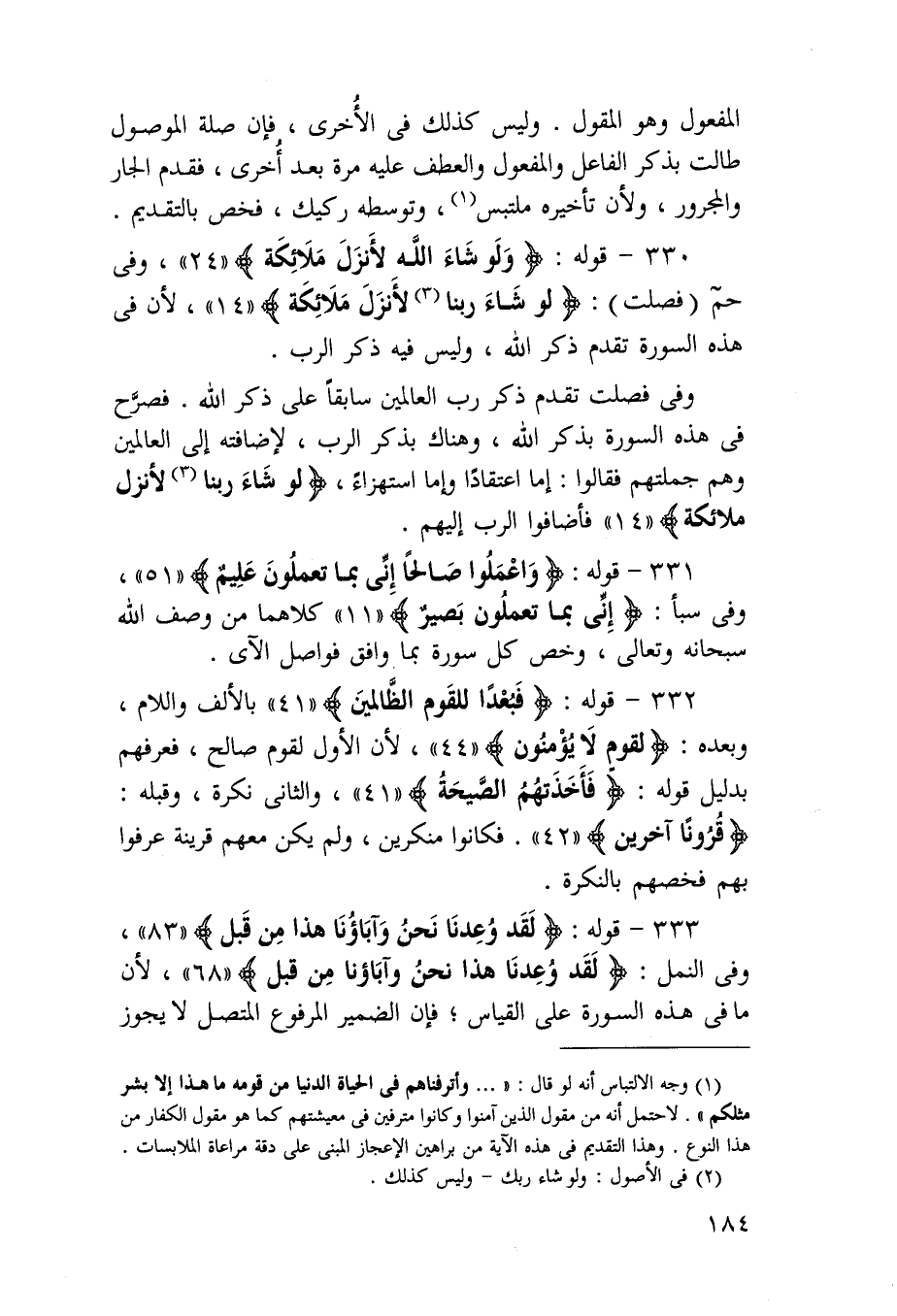 333 - قَوْله {لقد وعدنا نَحن وآباؤنا هَذَا من قبل} وَفِي النَّمْل {لقد وعدنا هَذَا نَحن وآباؤنا من قبل} لِأَن مَا فِي هَذِه السُّورَة على الْقيَاس فَإِن الضَّمِير الْمَرْفُوع الْمُتَّصِل لَا يجوز