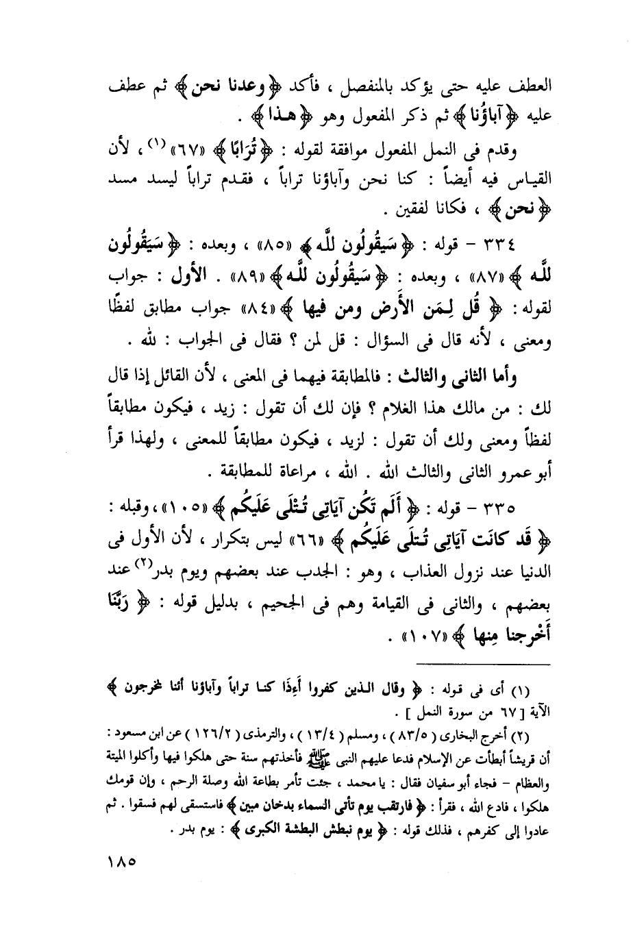 335 - قَوْله {ألم تكن آياتي تتلى عَلَيْكُم} وَقَبله {قد كَانَت آياتي تتلى عَلَيْكُم} لَيْسَ بتكرار لِأَن الأول فِي الدُّنْيَا عِنْد نزُول الْعَذَاب وَهُوَ الجدب عِنْد بَعضهم وَيَوْم بدر عِنْد بَعضهم وَالثَّانِي فِي الْقِيَامَة وهم فِي الْجَحِيم بِدَلِيل قَوْله {رَبنَا أخرجنَا مِنْهَا}