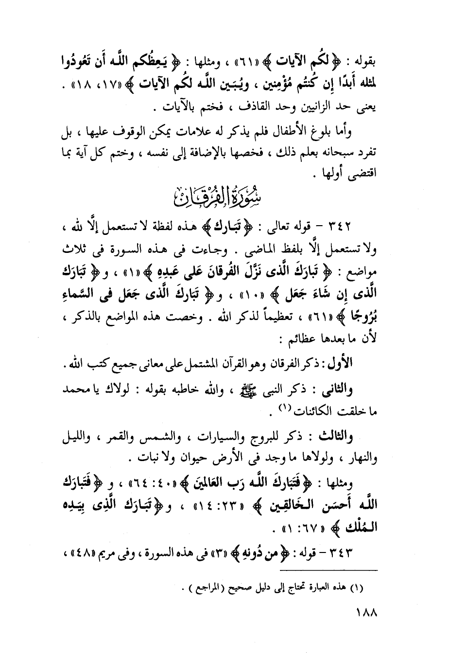 342 - قَوْله تَعَالَى {تبَارك} هَذِه لَفْظَة لَا تسْتَعْمل إِلَّا لله وَلَا تسْتَعْمل إِلَّا بِلَفْظ الْمَاضِي وَجَاءَت فِي هَذِه السُّورَة فِي ثَلَاث مَوَاضِع {تبَارك الَّذِي نزل الْفرْقَان على عَبده} و {تبَارك الَّذِي إِن شَاءَ جعل} و {تبَارك الَّذِي جعل فِي السَّمَاء بروجا} تَعْظِيمًا لذكر الله وخصت هَذِه الْمَوَاضِع بِالذكر لِأَن مَا بعْدهَا عظائم الأول ذكر الْفرْقَان وَهُوَ الْقُرْآن الْمُشْتَمل على مَعَاني جَمِيع كتب الله وَالثَّانِي ذكر النَّبِي وَالله