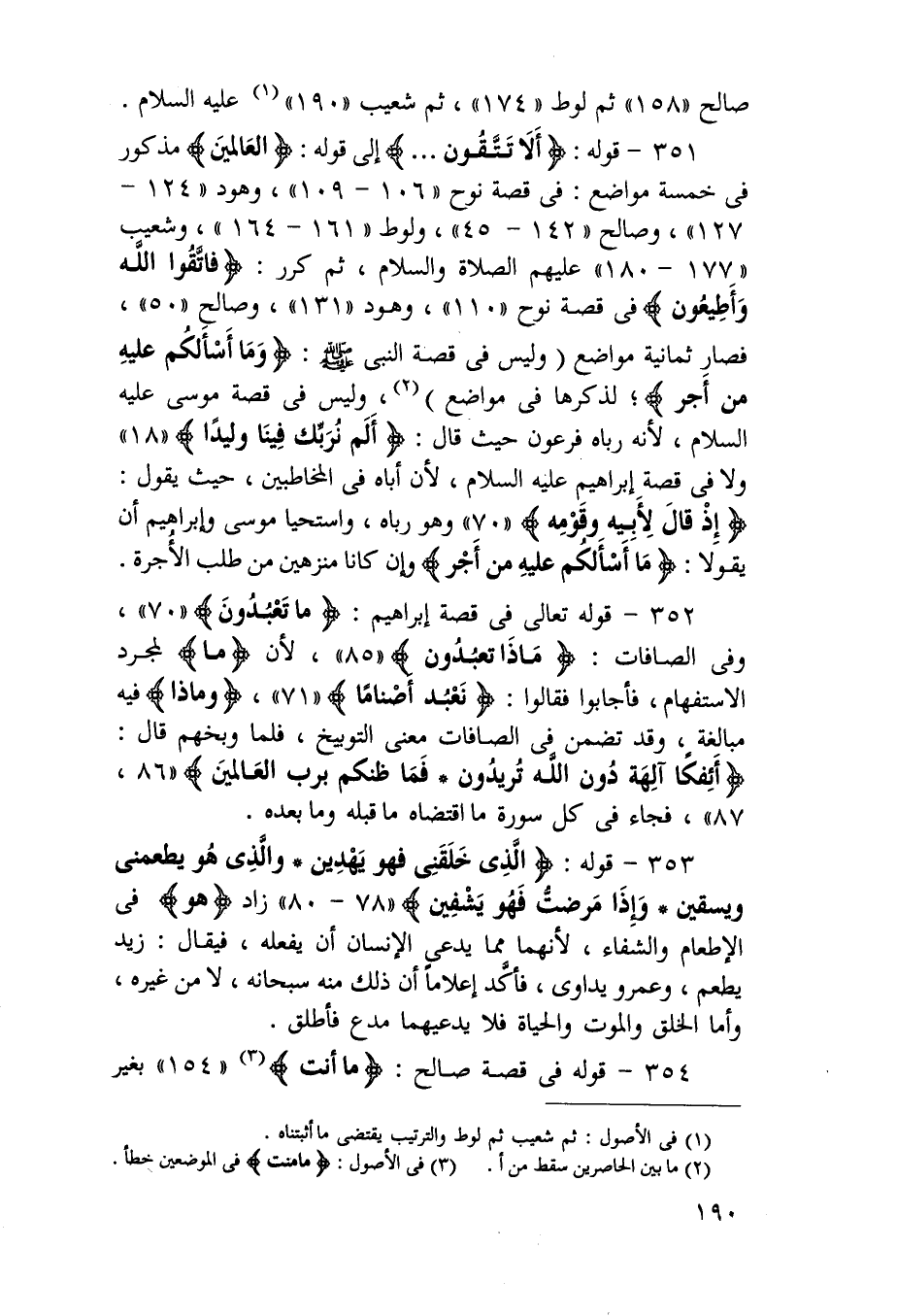 351 - قَوْله {أَلا تَتَّقُون} إِلَى قَوْله {الْعَالمين} مَذْكُور فِي خَمْسَة مَوَاضِع فِي قصَّة نوح 106 109 وَهود 124 127 وَصَالح 142 45 وَلُوط 161 164 وَشُعَيْب 177 180 عَلَيْهِم السَّلَام ثمَّ كرر {فَاتَّقُوا الله وأطيعون} فِي قصَّة نوح 110 وَهود 131 وَصَالح 50 فَصَارَ ثَمَانِيَة مَوَاضِع وَلَيْسَ فِي قصَّة النَّبِي صَلَّى اللهُ عَلَيْهِ وَسَلَّمَ عَلَيْهِ السَّلَام لِأَنَّهُ رباه فِرْعَوْن حَيْثُ قَالَ {ألم نربك فِينَا وليدا} وَلَا فِي قصَّة إِبْرَاهِيم عَلَيْهِ السَّلَام لِأَن أَبَاهُ فِي المخاطبين حَيْثُ يَقُول {إِذْ قَالَ لِأَبِيهِ وَقَومه} وَهُوَ رباه واستحيا مُوسَى وَإِبْرَاهِيم أَن يَقُولَا {مَا أَسأَلكُم عَلَيْهِ من أجر} وَإِن كَانَا منزهين من طلب الْأُجْرَة