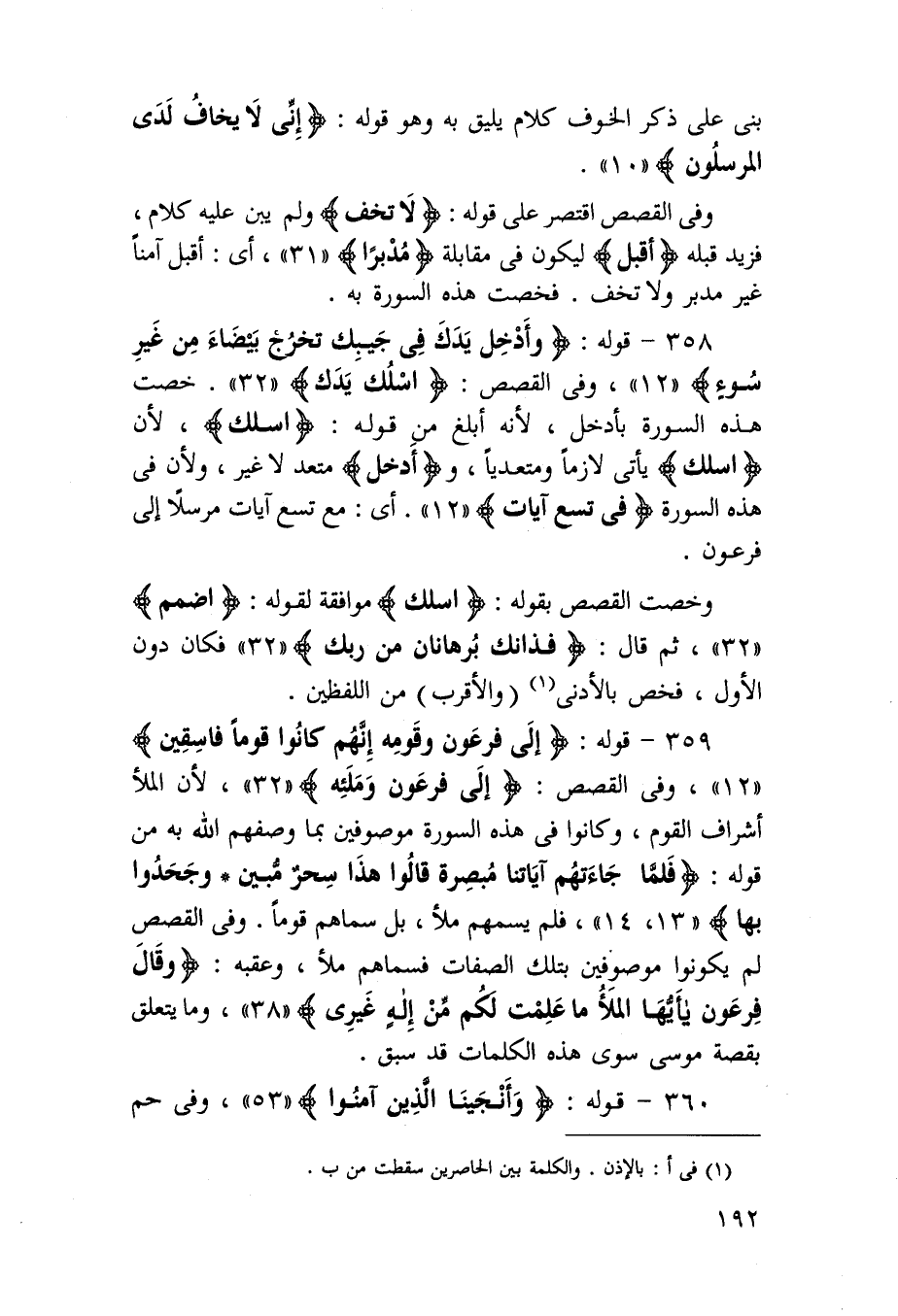 359 - قَوْله {إِلَى فِرْعَوْن وَقَومه إِنَّهُم كَانُوا قوما فاسقين} وَفِي الْقَصَص {إِلَى فِرْعَوْن وملئه} لِأَن الْمَلأ أَشْرَاف الْقَوْم وَكَانُوا فِي هَذِه السُّورَة موصوفين بِمَا وَصفهم الله بِهِ من قَوْله {فَلَمَّا جَاءَتْهُم آيَاتنَا مبصرة قَالُوا هَذَا سحر مُبين} {وجحدوا بهَا} الْآيَة فَلم يسمهم مَلأ بل سماهم قوما وَفِي الْقَصَص لم يَكُونُوا موصوفين بِتِلْكَ الصِّفَات فسماهم مَلأ وعقبه {وَقَالَ فِرْعَوْن يَا أَيهَا الْمَلأ مَا علمت لكم من إِلَه غَيْرِي} وَمَا يتَعَلَّق بِقصَّة مُوسَى سوى هَذِه الْكَلِمَات قد سبق