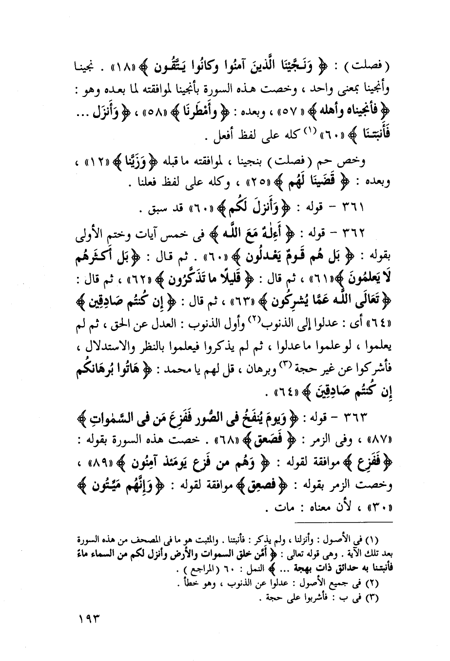 فصلت {ونجينا الَّذين آمنُوا وَكَانُوا يَتَّقُونَ} نجينا وأنجينا بِمَعْنى وَاحِد وخصت هَذِه السُّورَة بأنجينا لموافقته لما بعده وَهُوَ {فأنجيناه وَأَهله} وَبعده {وأمطرنا} {وَأنزل} {فَأَنْبَتْنَا} كُله على لفظ أفعل