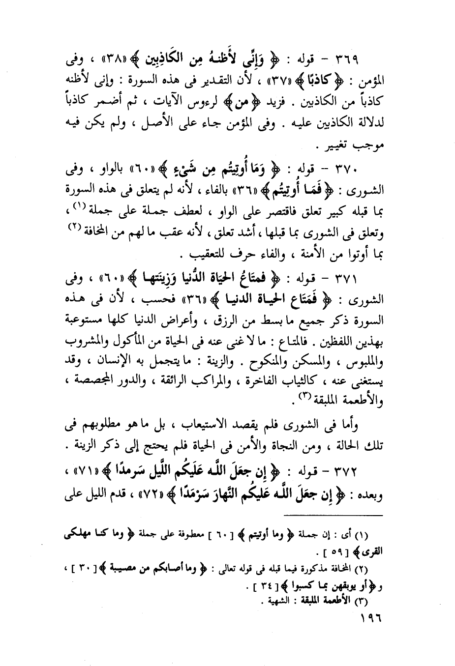 370 - قَوْله {وَمَا أُوتِيتُمْ من شَيْء} بِالْوَاو وَفِي الشورى {فَمَا أُوتِيتُمْ} بِالْفَاءِ لِأَنَّهُ لم يتَعَلَّق فِي هَذِه السُّورَة بِمَا قبله كَبِير تعلق فاقتصر على الْوَاو لعطف جملَة على جملَة وَتعلق فِي الشورى بِمَا قبلهَا أَشد تعلق لِأَنَّهُ عقب مَا لَهُم من المخافة بِمَا أُوتُوا من الأمنة وَالْفَاء حرف للتعقيب