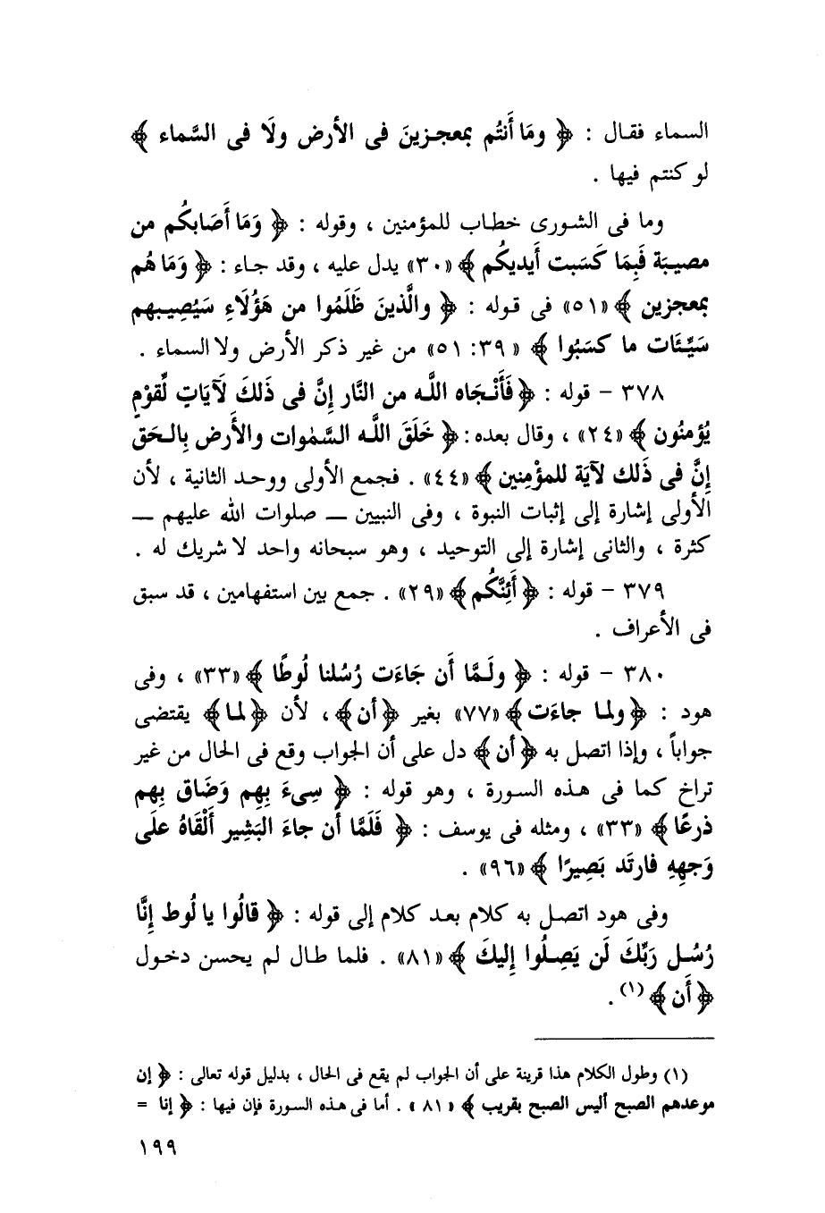 380 - قَوْله {وَلما أَن جَاءَت رسلنَا لوطا} وَفِي هود {وَلما جَاءَت} بِغَيْر {إِن} لِأَن {لما} يَقْتَضِي جَوَابا وَإِذا اتَّصل بِهِ {إِن} دلّ على أَن الْجَواب وَقع فِي الْحَال من غير تراخ كَمَا فِي هَذِه السُّورَة وَهُوَ قَوْله {سيء بهم وضاق بهم ذرعا} وَمثله فِي يُوسُف {فَلَمَّا أَن جَاءَ البشير أَلْقَاهُ على وَجهه فَارْتَد بَصيرًا}