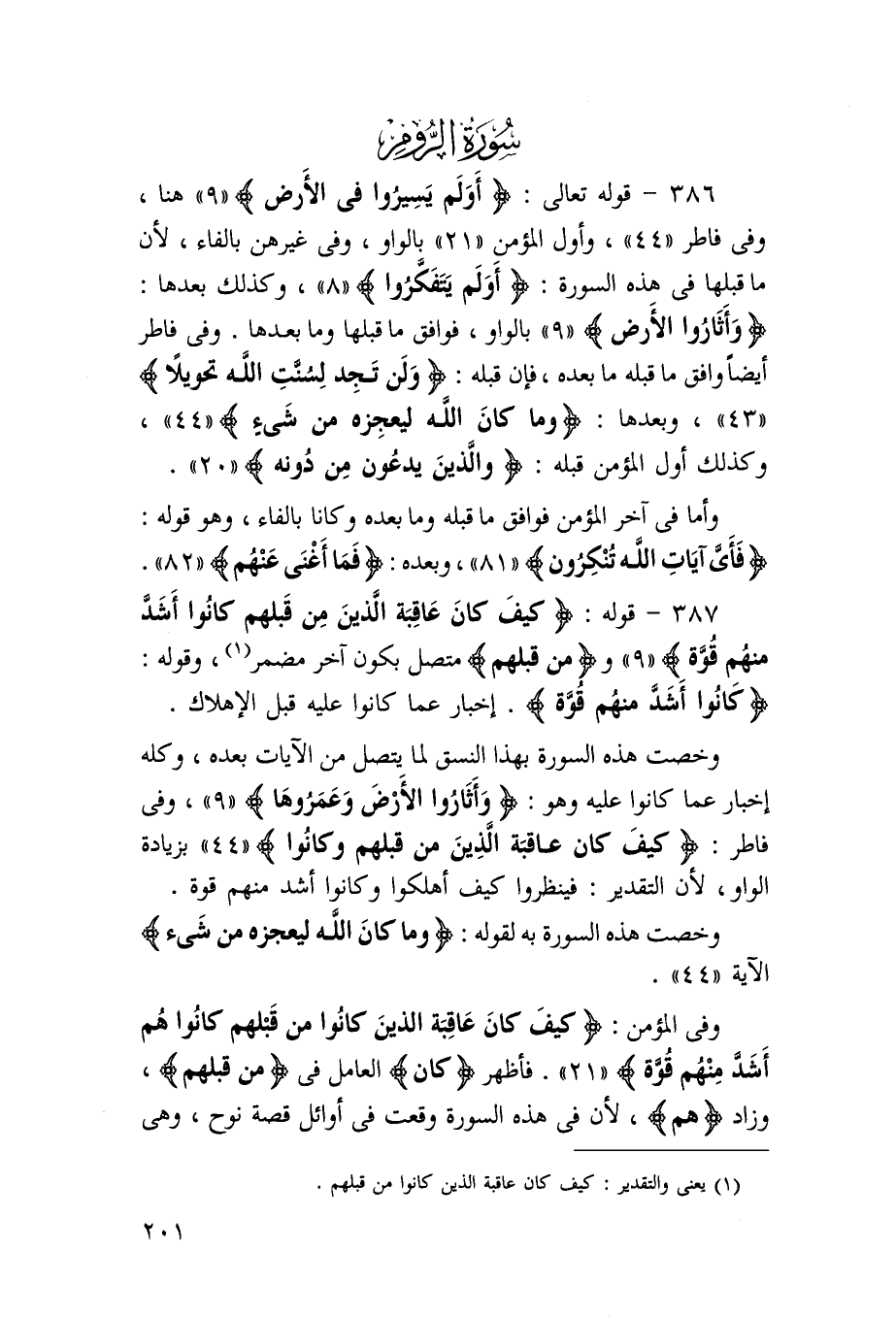 386 - قَوْله تَعَالَى {أَو لم يَسِيرُوا فِي الأَرْض} هُنَا وَفِي فاطر 44 وَأول الْمُؤمن 21 بِالْوَاو وَفِي غَيْرهنَّ بِالْفَاءِ لِأَن مَا قبلهَا فِي هَذِه السُّورَة {أَو لم يتفكروا} وَكَذَلِكَ بعْدهَا {وأثاروا الأَرْض} بِالْوَاو فَوَافَقَ مَا قبلهَا وَمَا بعْدهَا وَفِي فاطر أَيْضا وَافق مَا قبله وَمَا بعده فَإِن قبله {وَلنْ تَجِد لسنة الله تحويلا} وَبعدهَا {وَمَا كَانَ الله ليعجزه من شَيْء} وَكَذَلِكَ أول الْمُؤمن قبله {وَالَّذين يدعونَ من دونه}