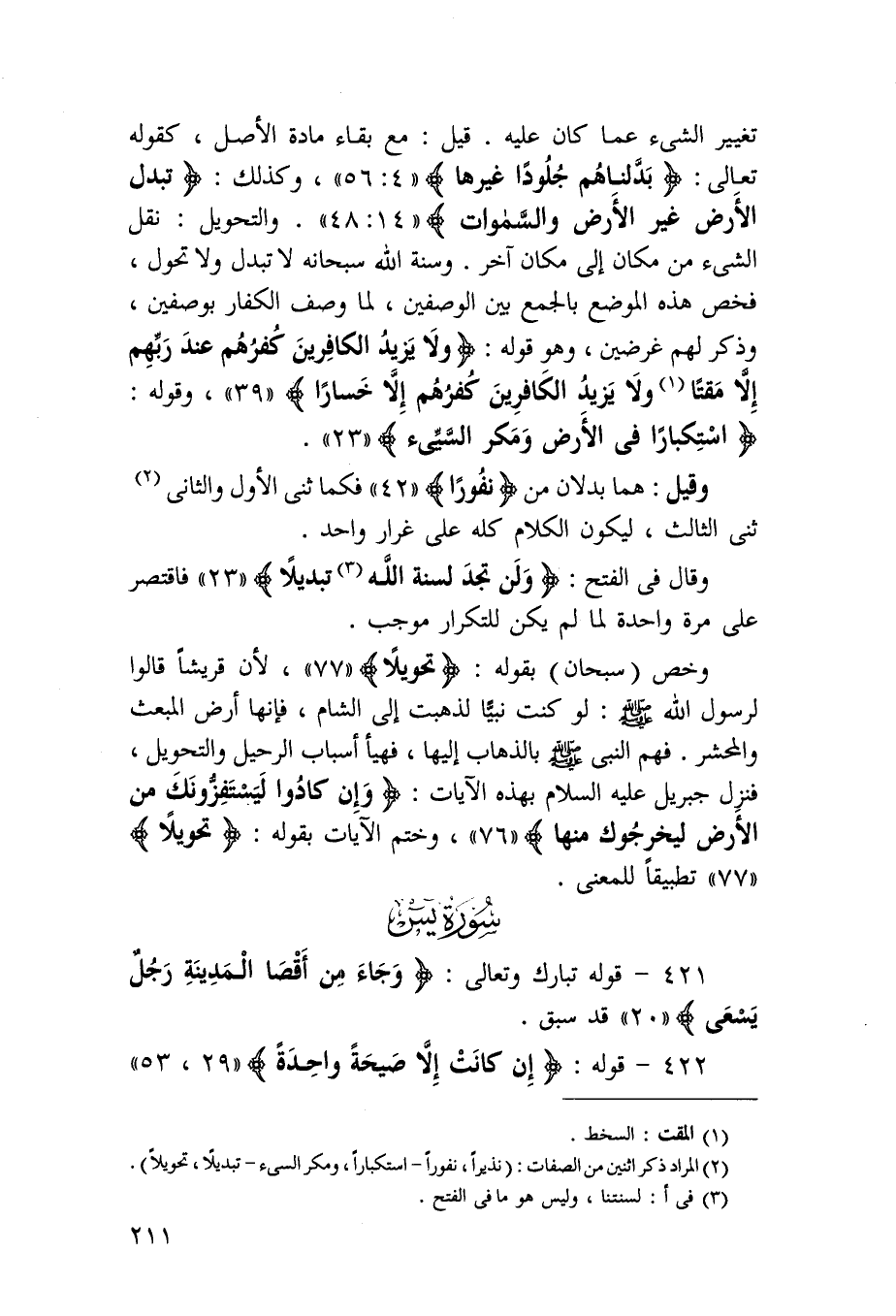 تَغْيِير الشَّيْء عَمَّا كَانَ عَلَيْهِ قيل مَعَ بَقَاء مَادَّة الأَصْل كَقَوْلِه تَعَالَى {بَدَّلْنَاهُمْ جُلُودًا غَيرهَا} وَكَذَلِكَ {تبدل الأَرْض غير الأَرْض وَالسَّمَاوَات} والتحويل نقل الشَّيْء من مَكَان إِلَى مَكَان آخر وَسنة الله سُبْحَانَهُ لَا تبدل وَلَا تحول فَخص هَذَا الْموضع بِالْجمعِ بَين الوصفين لما وصف الْكفَّار بوصفين وَذكر لَهُم غرضين وَهُوَ قَوْله {وَلَا يزِيد الْكَافرين كفرهم عِنْد رَبهم إِلَّا مقتا} {وَلَا يزِيد الْكَافرين كفرهم إِلَّا خسارا} وَقَوله {استكبارا فِي الأَرْض ومكر السيء}