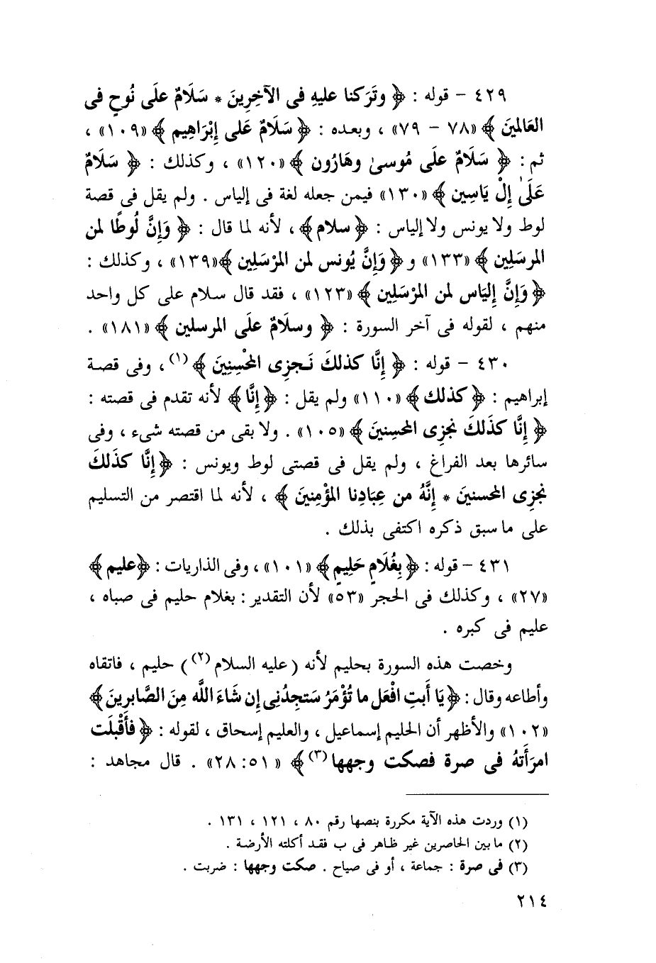 430 - قَوْله {وَتَركنَا عَلَيْهِ فِي الآخرين} {سَلام على نوح فِي الْعَالمين} وَبعده {سَلام على إِبْرَاهِيم} ثمَّ {سَلام على مُوسَى وَهَارُون} وَكَذَلِكَ {سَلام على إل ياسين} فِيمَن جعله لُغَة فِي إلْيَاس وَلم يقل فِي قصَّة لوط وَلَا يُونُس وَلَا إلْيَاس {سَلام} لِأَنَّهُ لما قَالَ {وَإِن لوطا لمن الْمُرْسلين} {وَإِن يُونُس لمن الْمُرْسلين} وَكَذَلِكَ {وَإِن إلْيَاس لمن الْمُرْسلين} فقد قَالَ سَلام على كل وَاحِد مِنْهُم لقَوْله فِي آخر السُّورَة {وَسَلام على الْمُرْسلين}