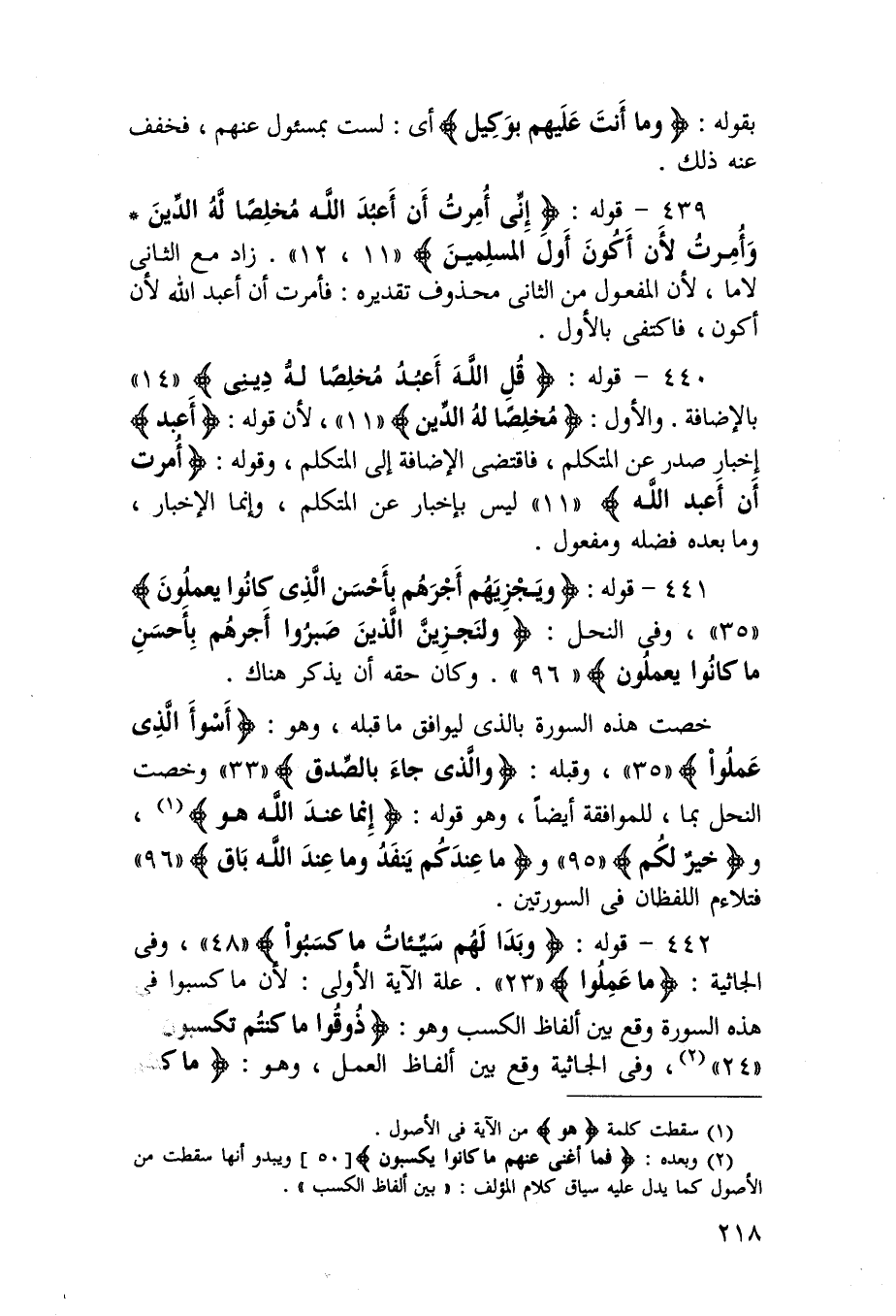 441 - قَوْله {قل الله أعبد مخلصا لَهُ ديني} بِالْإِضَافَة وَالْأول {مخلصا لَهُ الدّين} لِأَن قَوْله {أعبد} إِخْبَار صدر عَن الْمُتَكَلّم فَاقْتضى الْإِضَافَة إِلَى الْمُتَكَلّم وَقَوله {أمرت أَن أعبد الله} لَيْسَ بِإِخْبَار عَن الْمُتَكَلّم وَإِنَّمَا الْإِخْبَار وَمَا بعده فَضله ومفعول