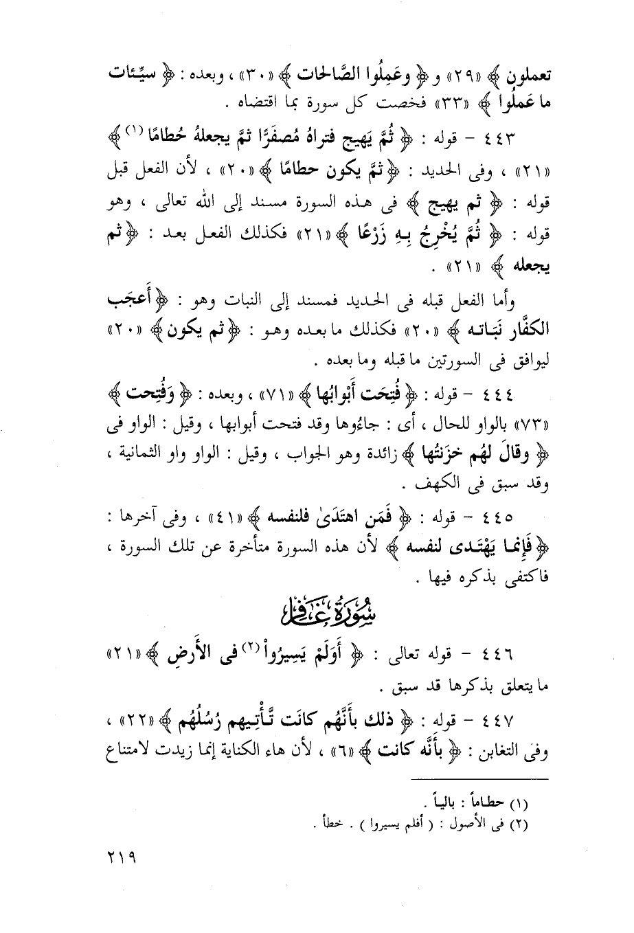 444 - قَوْله {ثمَّ يهيج فتراه مصفرا ثمَّ يَجعله حطاما} وَفِي الْحَدِيد {ثمَّ يكون حطاما} لِأَن الْفِعْل الْوَاقِع بعد قَوْله {ثمَّ يهيج} فِي هَذِه السُّورَة مُسْند إِلَى الله تَعَالَى وَهُوَ قَوْله {ثمَّ يخرج بِهِ زرعا} فَكَذَلِك الْفِعْل بعده {ثمَّ يَجعله}